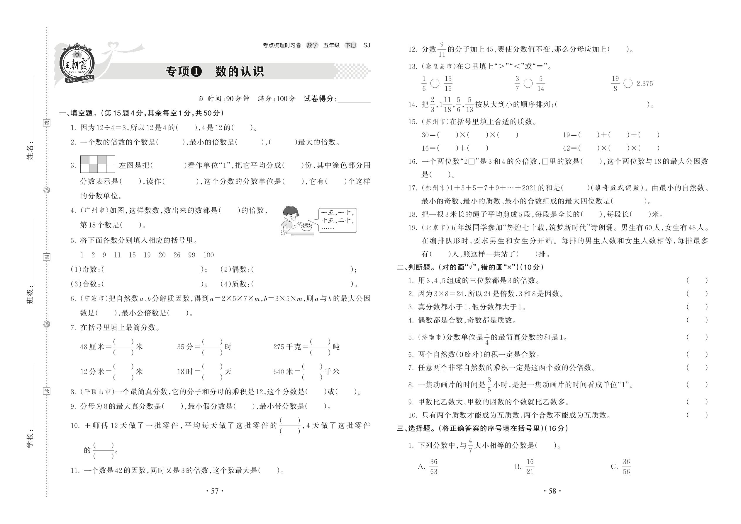 2022下册五年级数学苏教版 专项1 数的认识