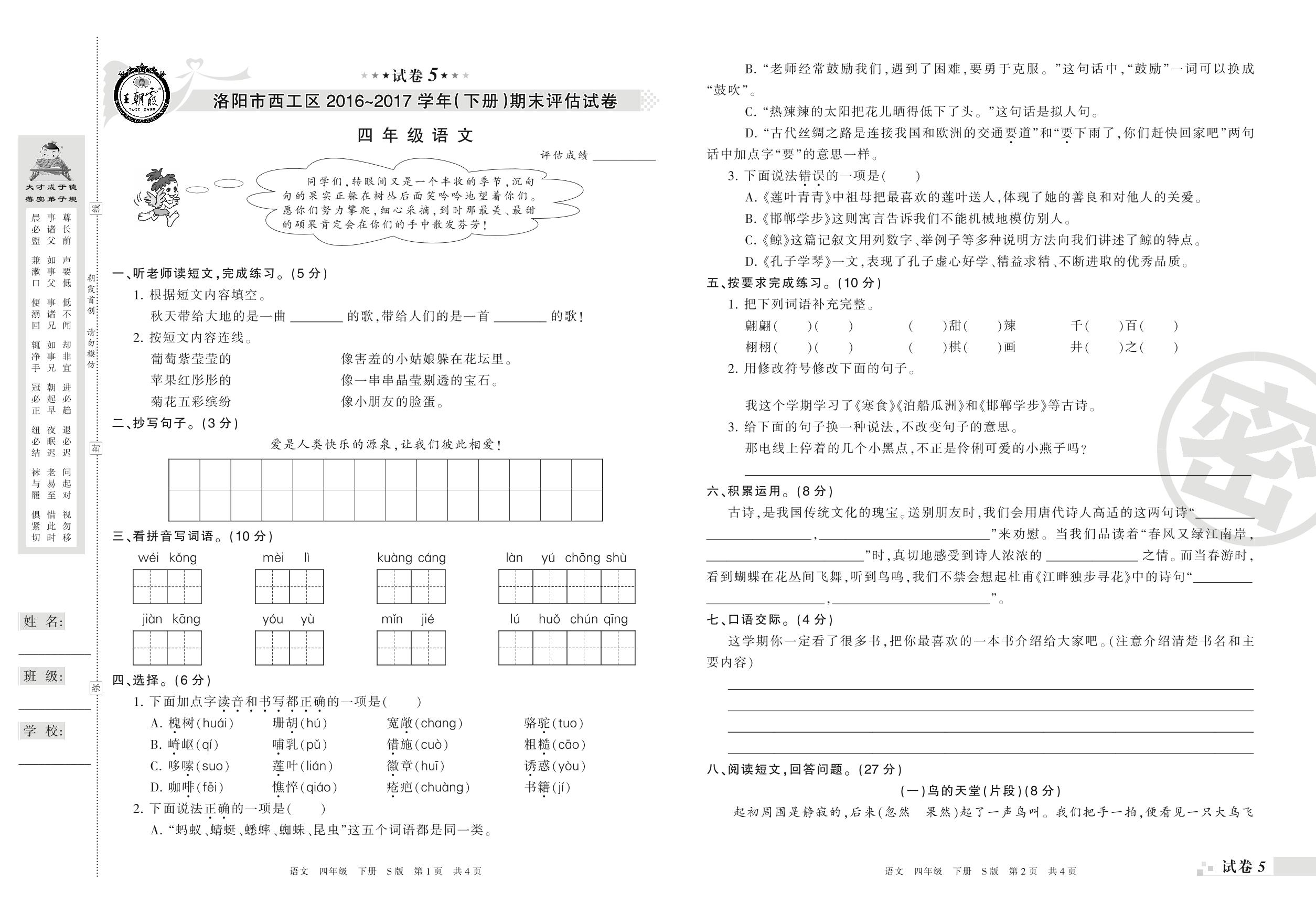 2016-2017学年第二学期洛阳市西工区四年级语文试卷(S版)【5】
