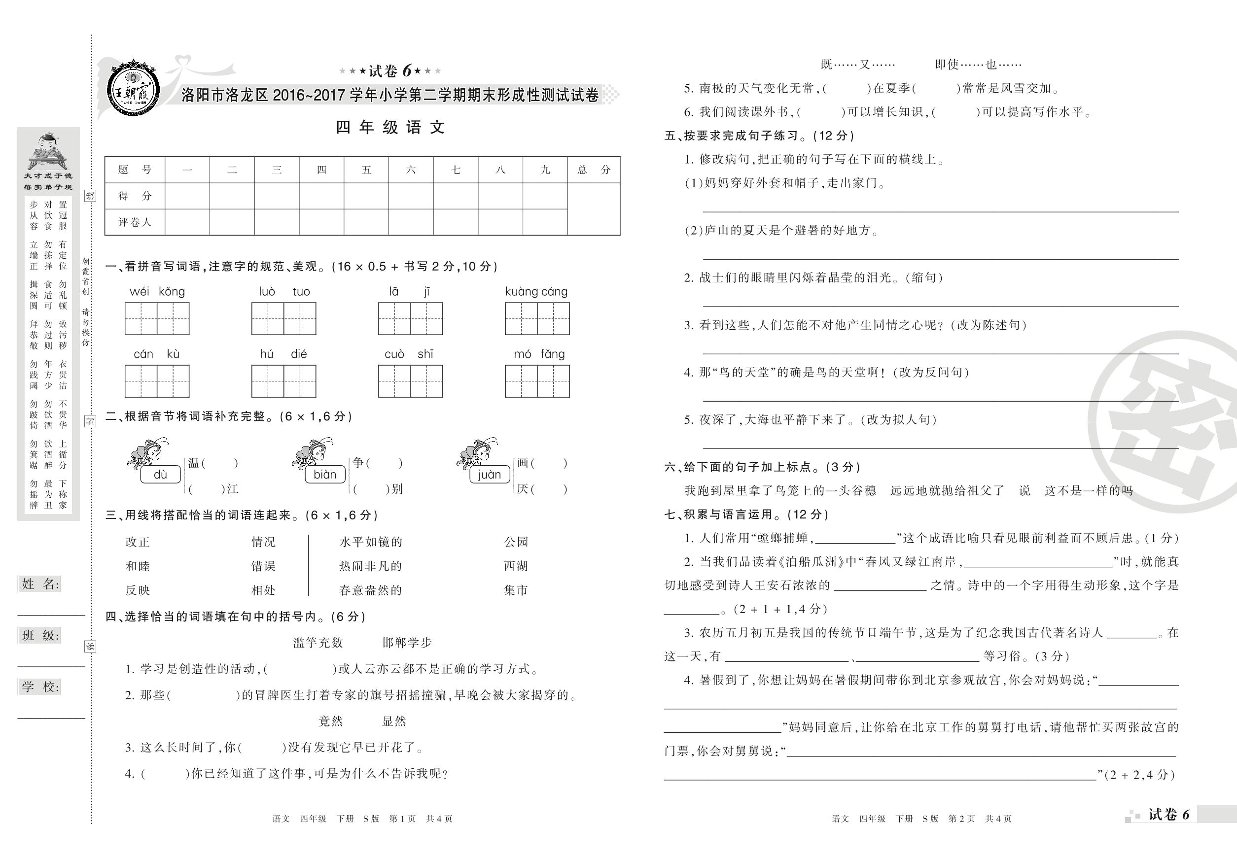 2016-2017学年第二学期洛阳市洛龙区四年级语文试卷(S版)【6】
