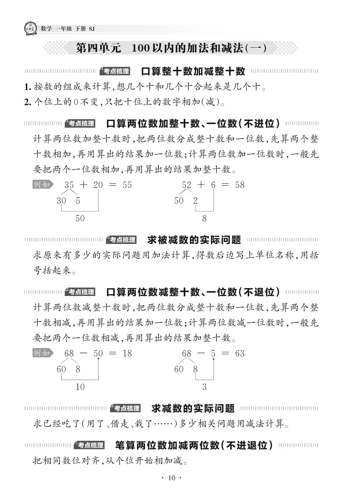 2022下册一年级数学苏教版 单元考点梳理——第四单元 100以内的加法和减法(一)