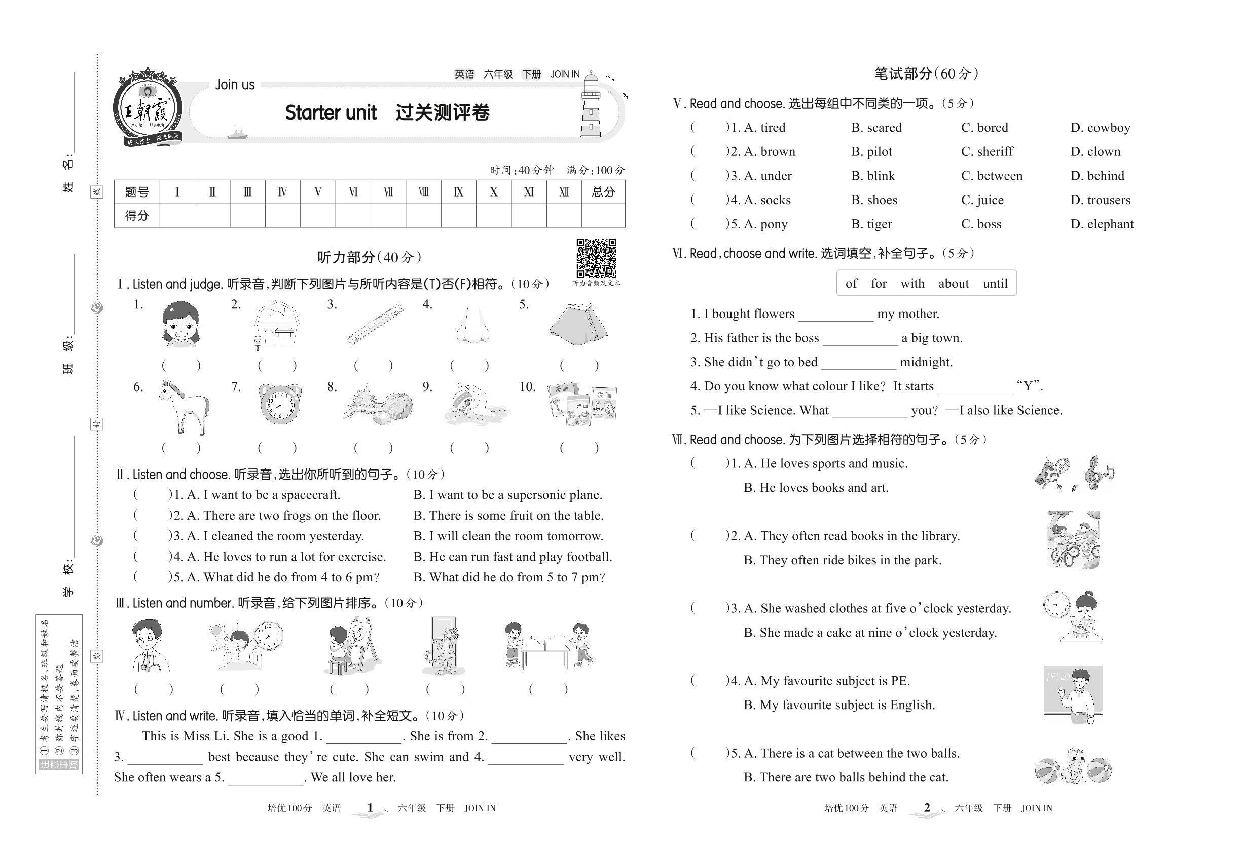 2022下册六年级英语剑桥版 Starter unit 过关测评卷