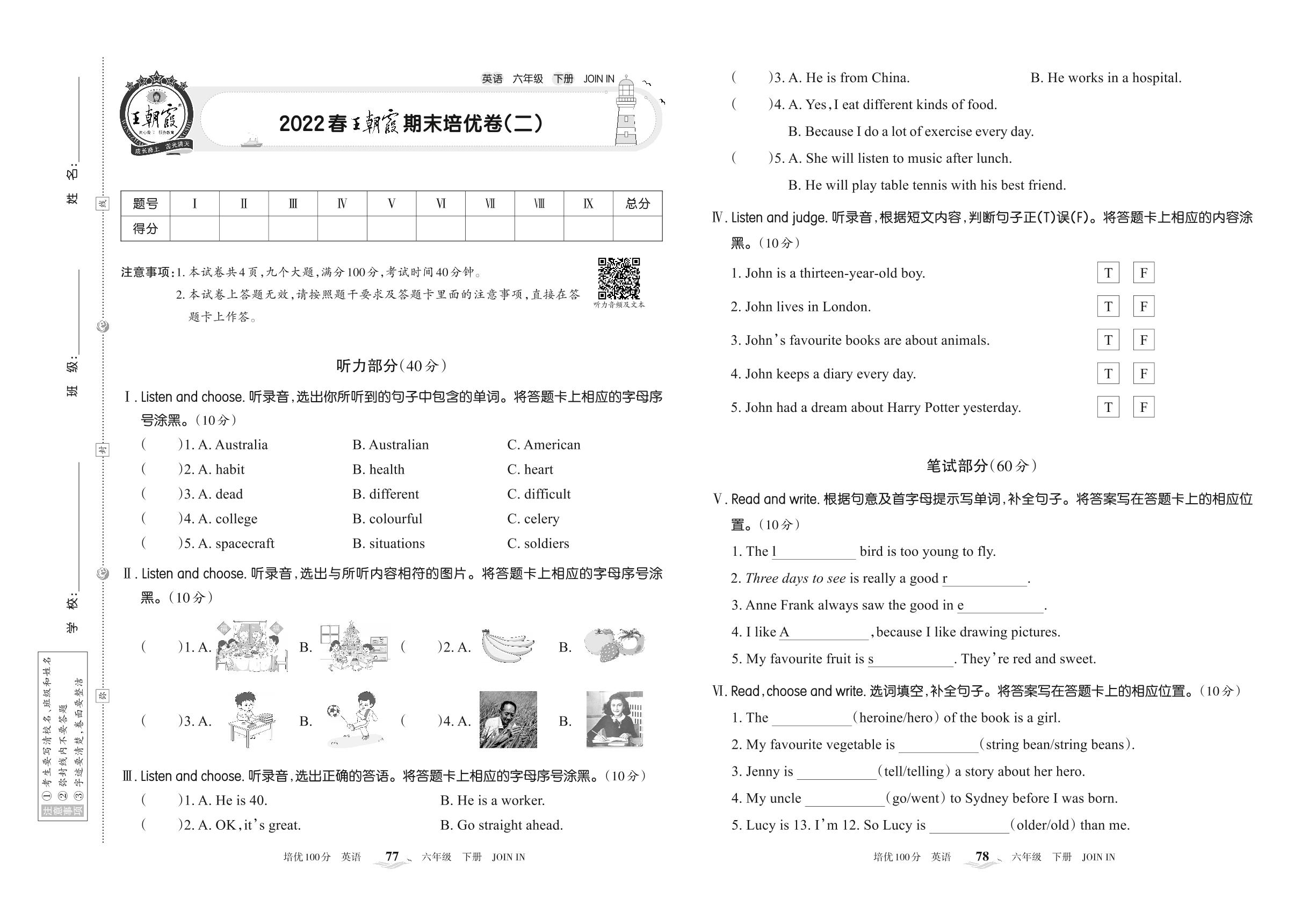 2022下册六年级英语剑桥版 王朝霞期末培优卷(二)