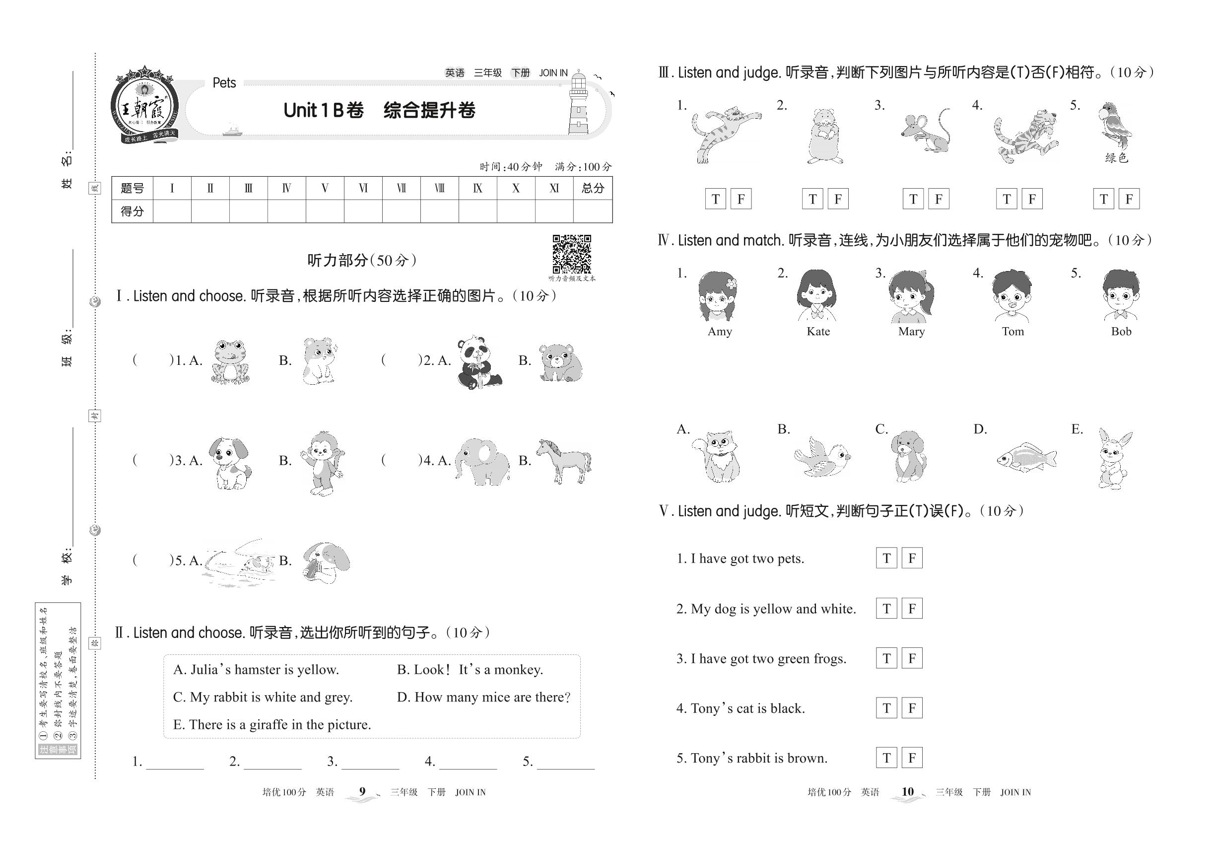 2022下册三年级英语剑桥版 Unit 1 B卷 综合提升卷