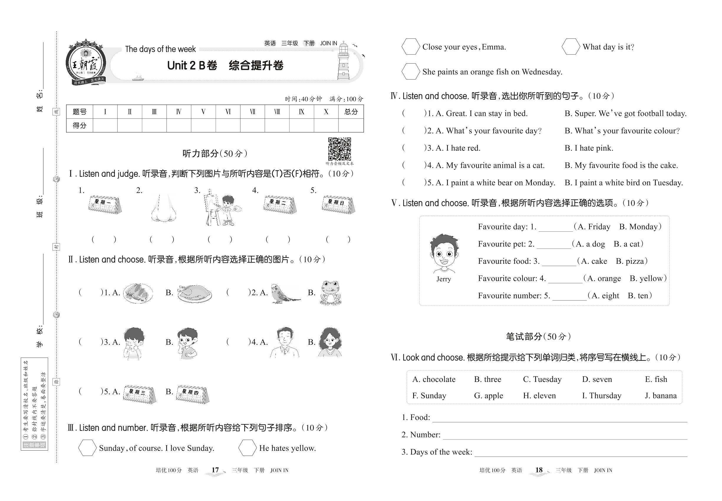 2022下册三年级英语剑桥版 Unit 2 B卷 综合提升卷