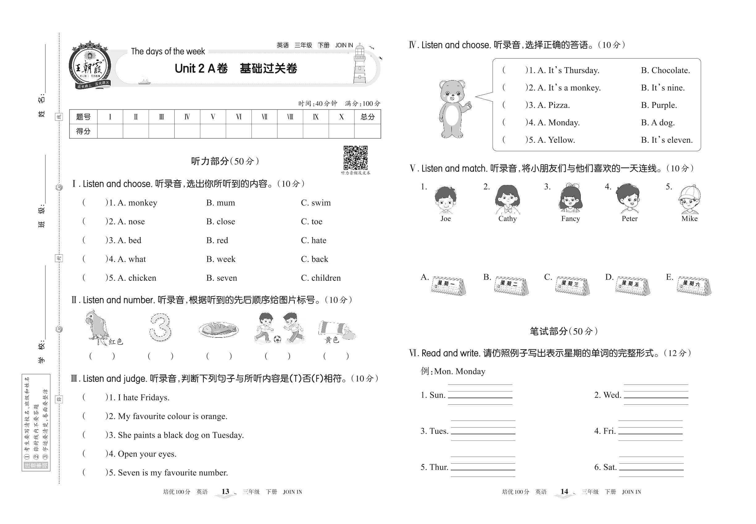 2022下册三年级英语剑桥版 Unit 2 A卷 基础过关卷