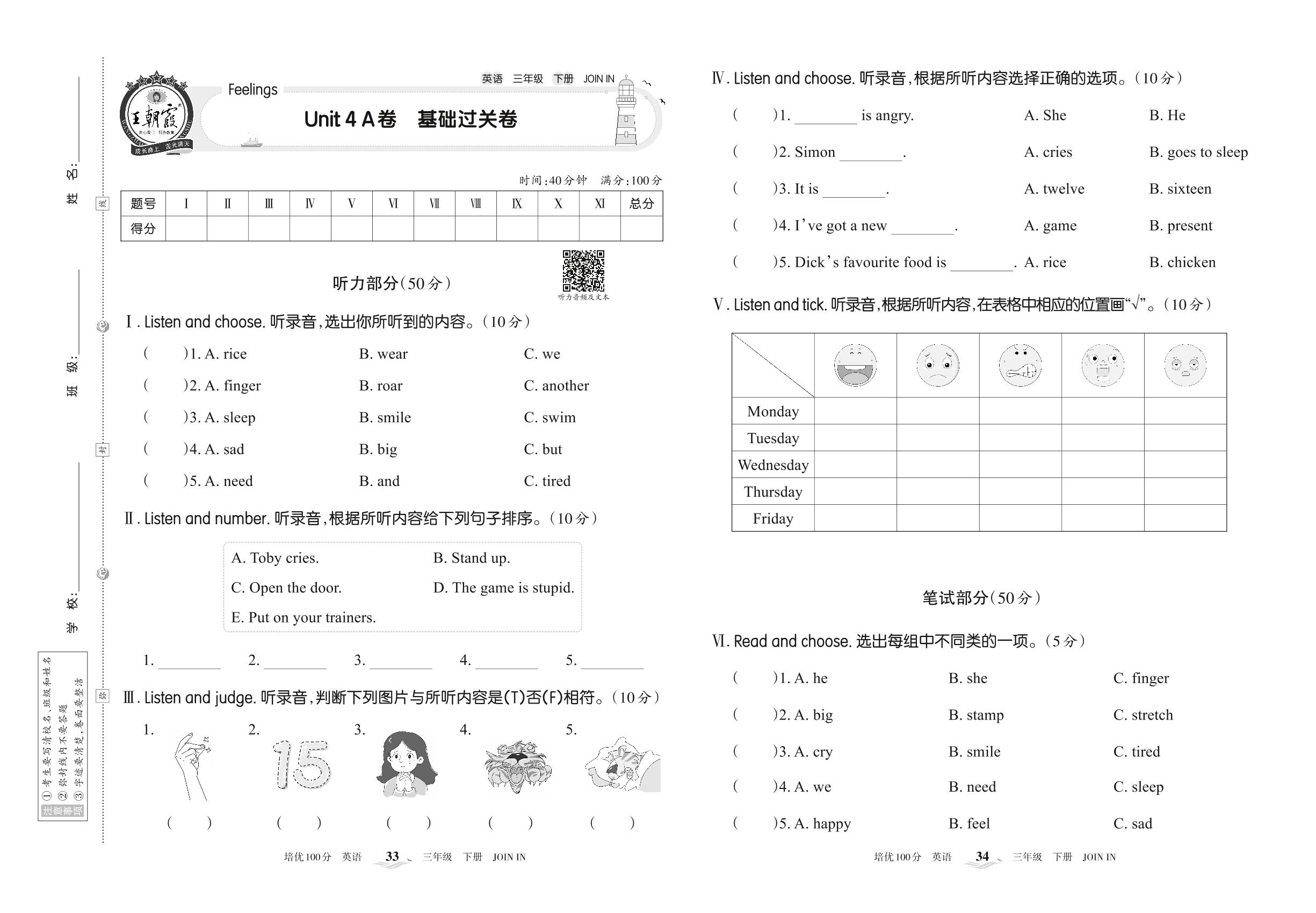 2022下册三年级英语剑桥版 Unit 4 A卷 基础过关卷