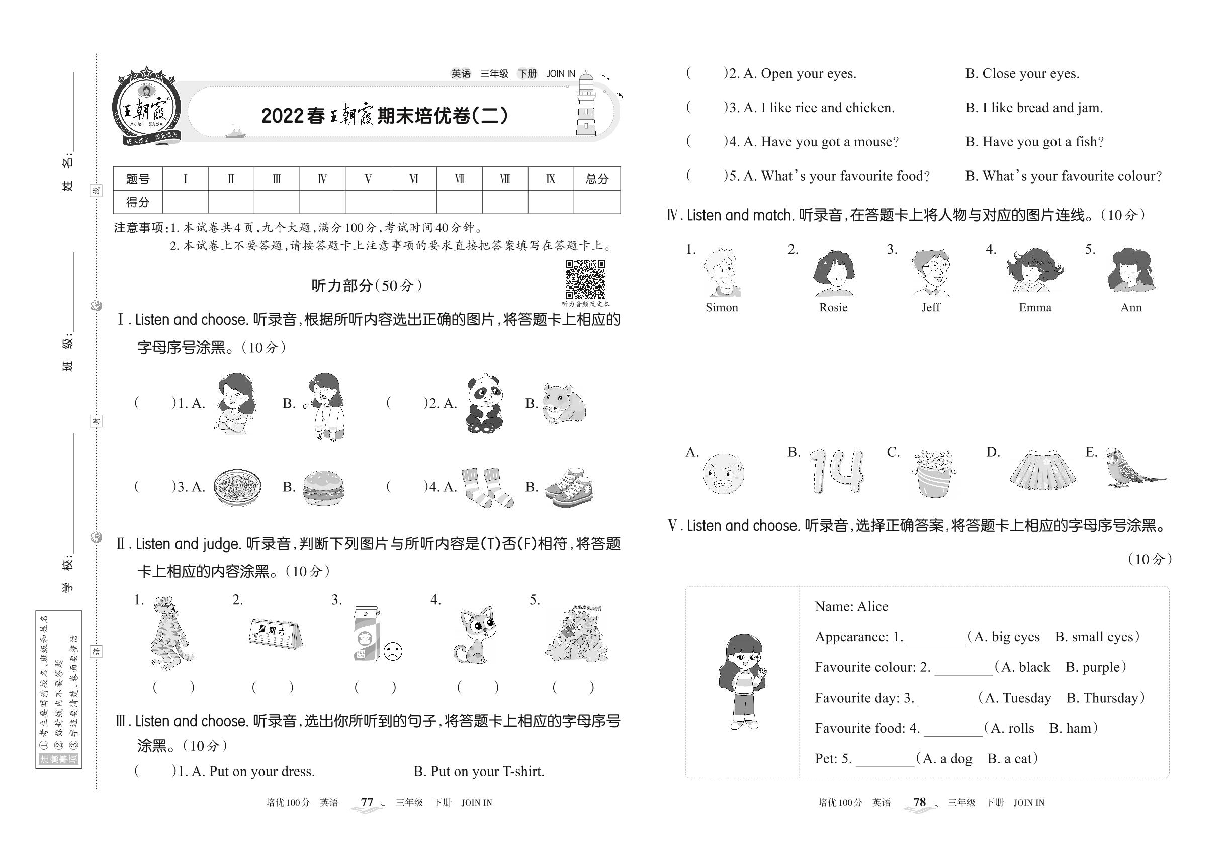 2022下册三年级英语剑桥版 王朝霞期末培优卷(二)