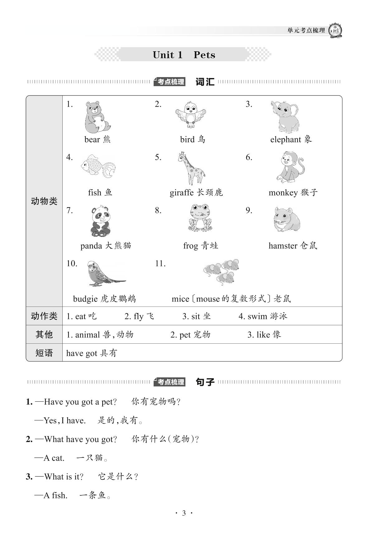 2022下册三年级英语剑桥版 单元考点梳理——Unit 1 Pets