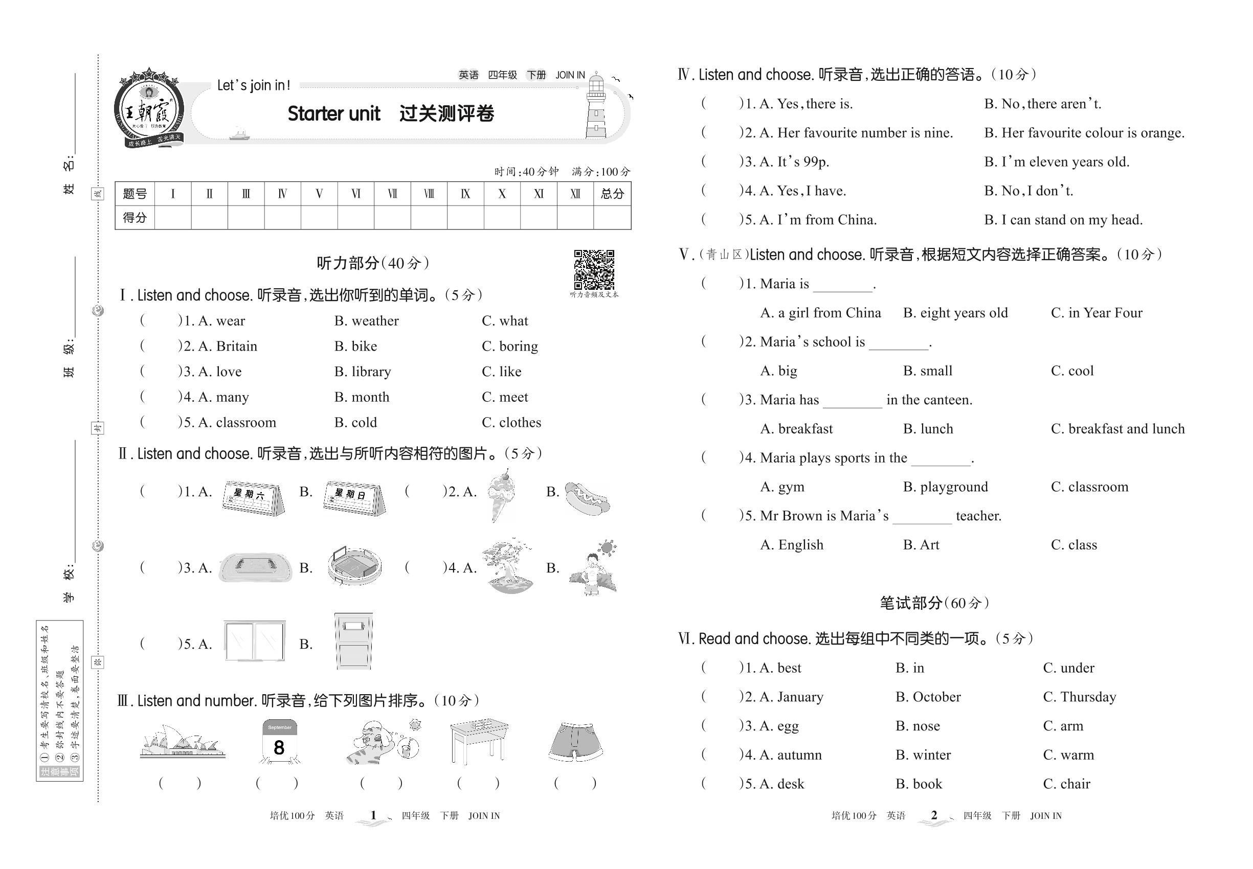 2022下册四年级英语剑桥版 Starter unit 过关测评卷