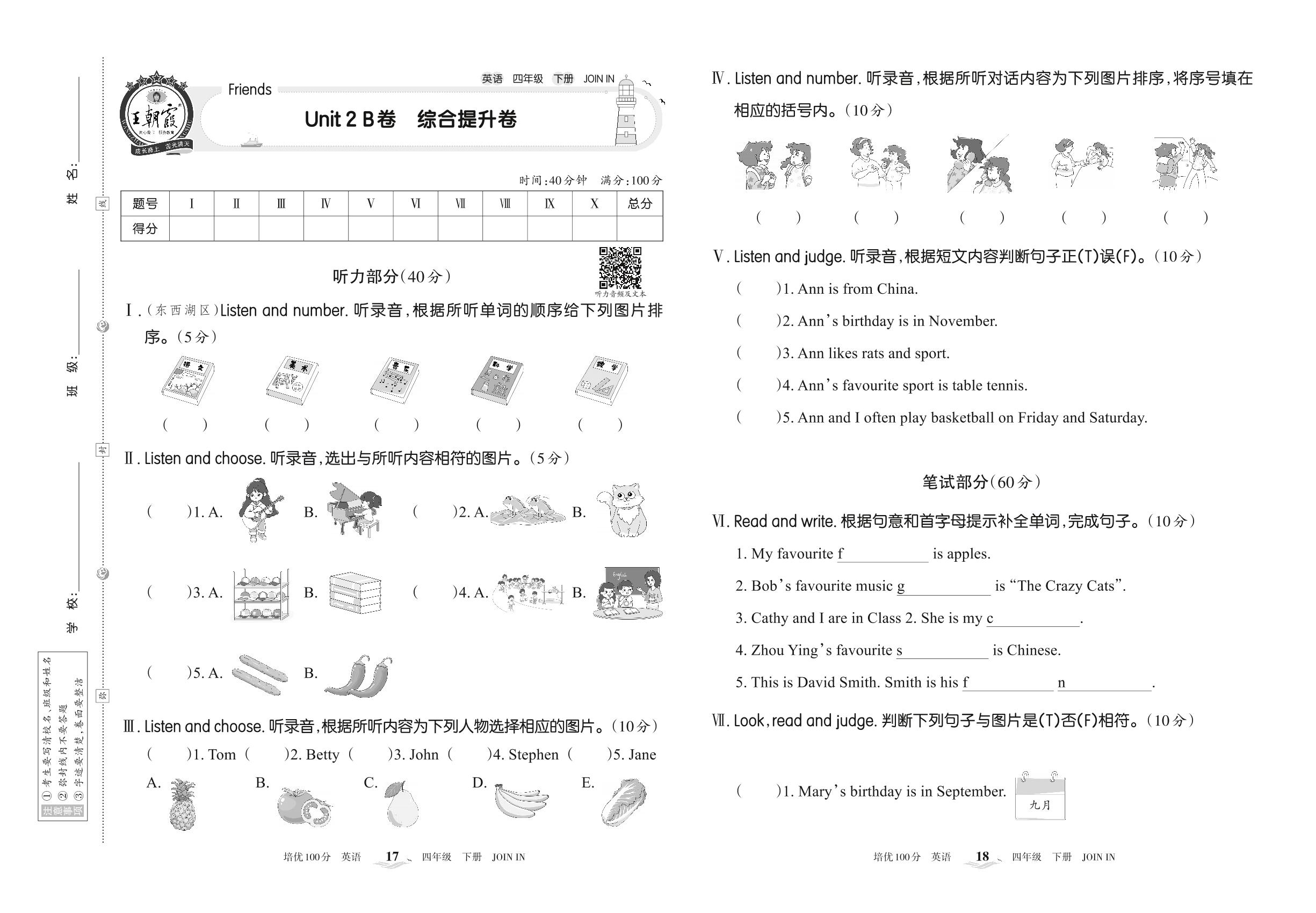 2022下册四年级英语剑桥版 Unit 2 B卷 综合提升卷