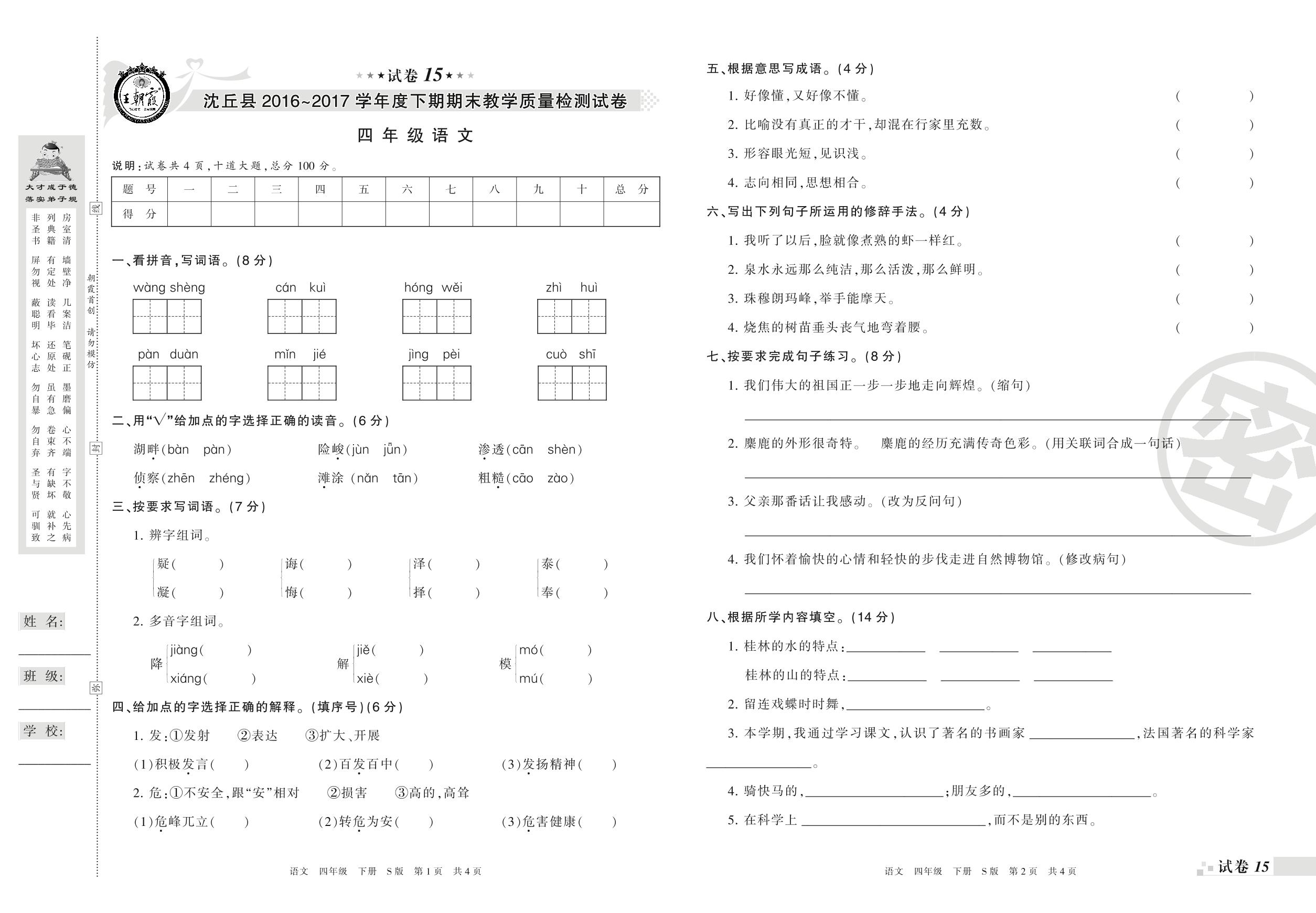 2016-2017学年第二学期周口市沈丘县四年级语文试卷(S版)【15】