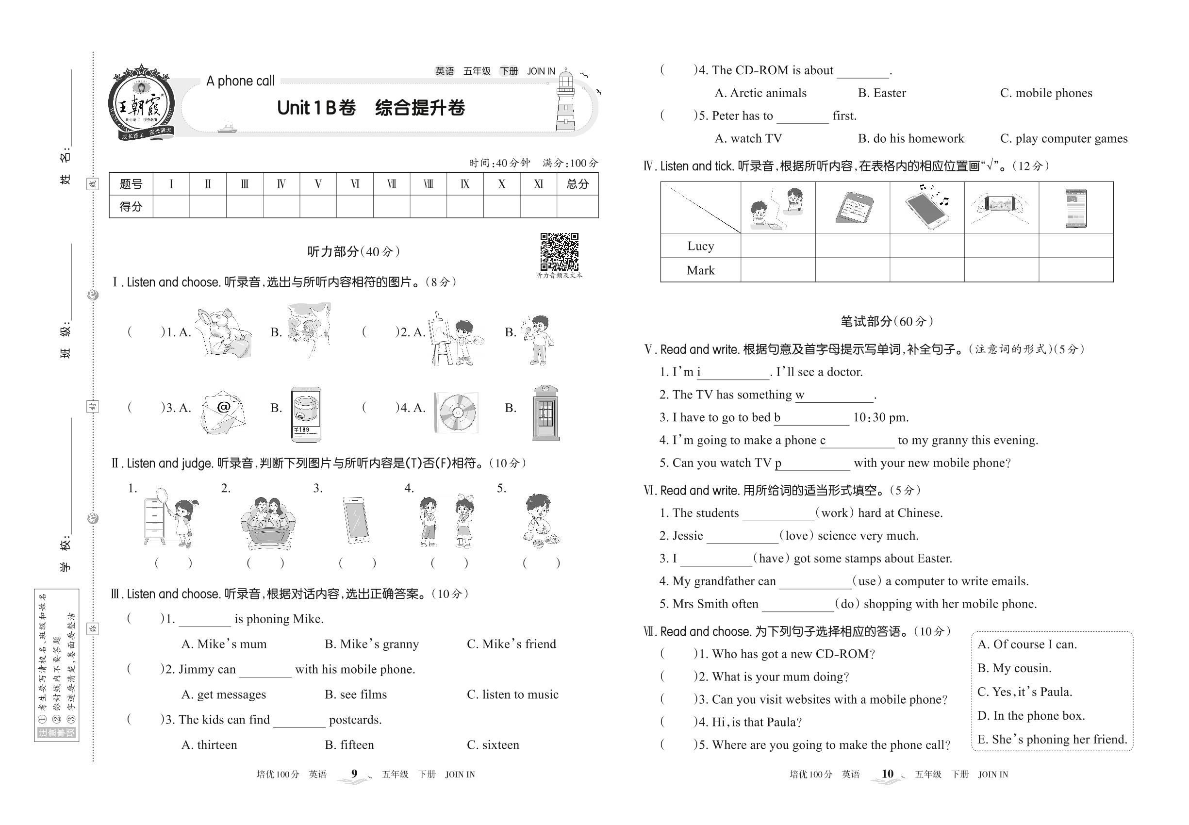 2022下册五年级英语剑桥版 Unit 1 B卷 综合提升卷
