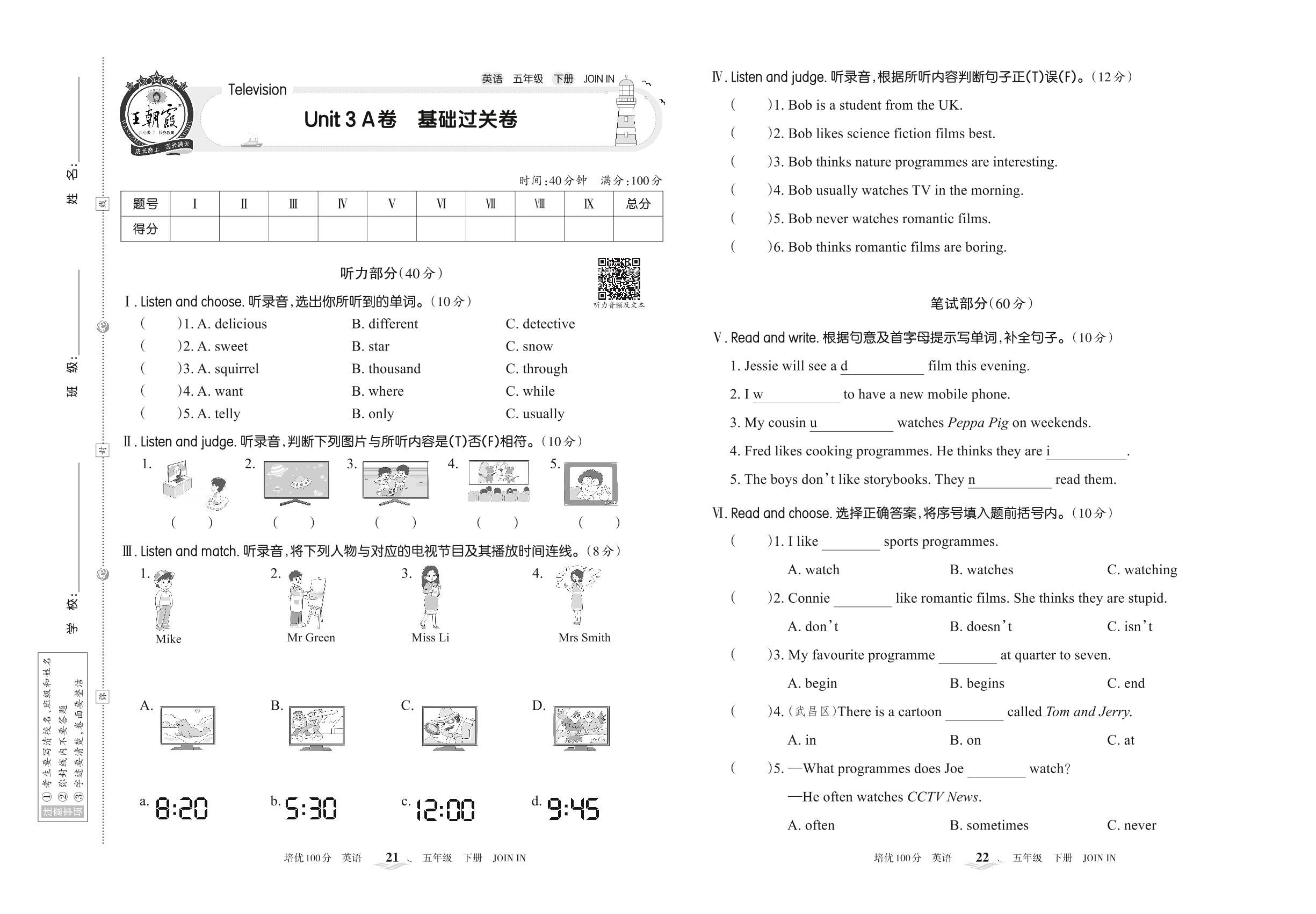 2022下册五年级英语剑桥版 Unit 3 A卷 基础过关卷