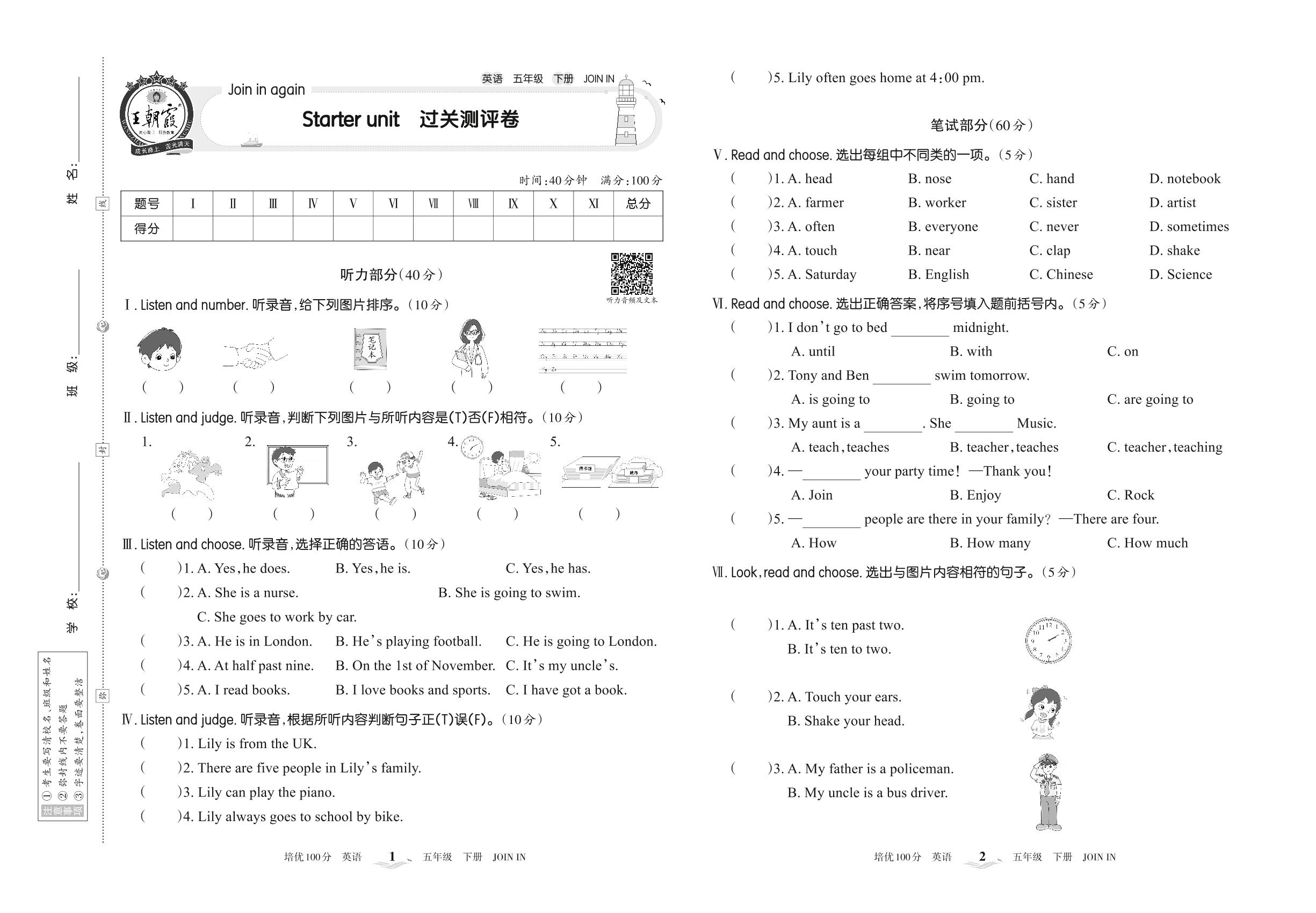2022下册五年级英语剑桥版 Starter unit 过关测评卷