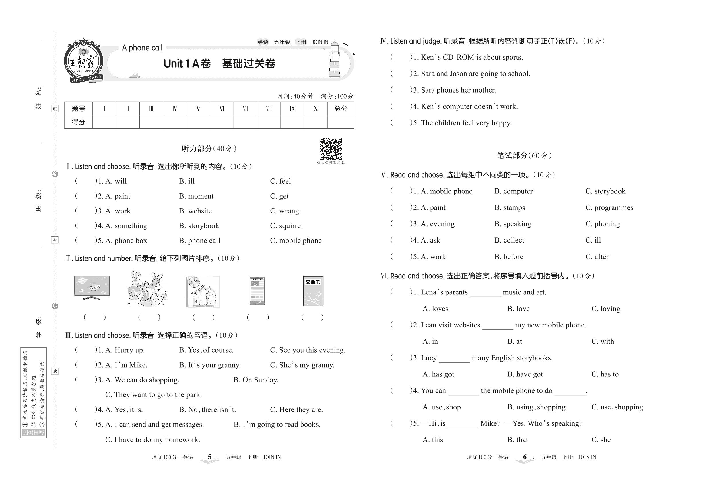 2022下册五年级英语剑桥版 Unit 1 A卷 基础过关卷