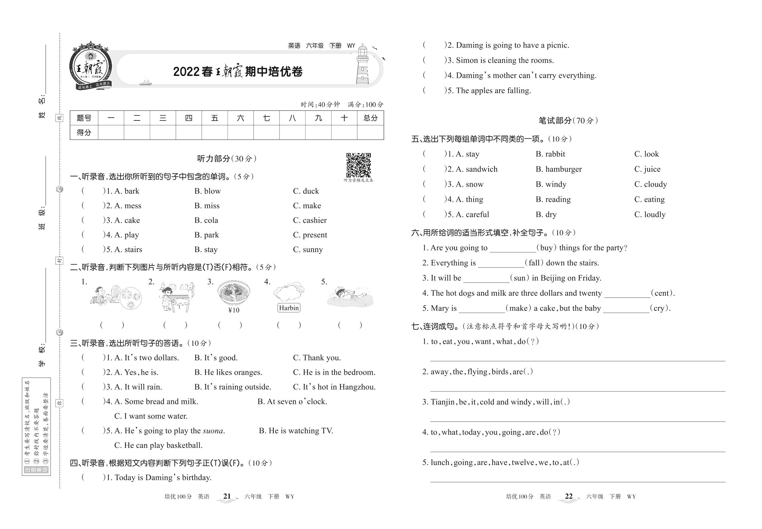 2022下册六年级英语外研版 王朝霞期中培优卷