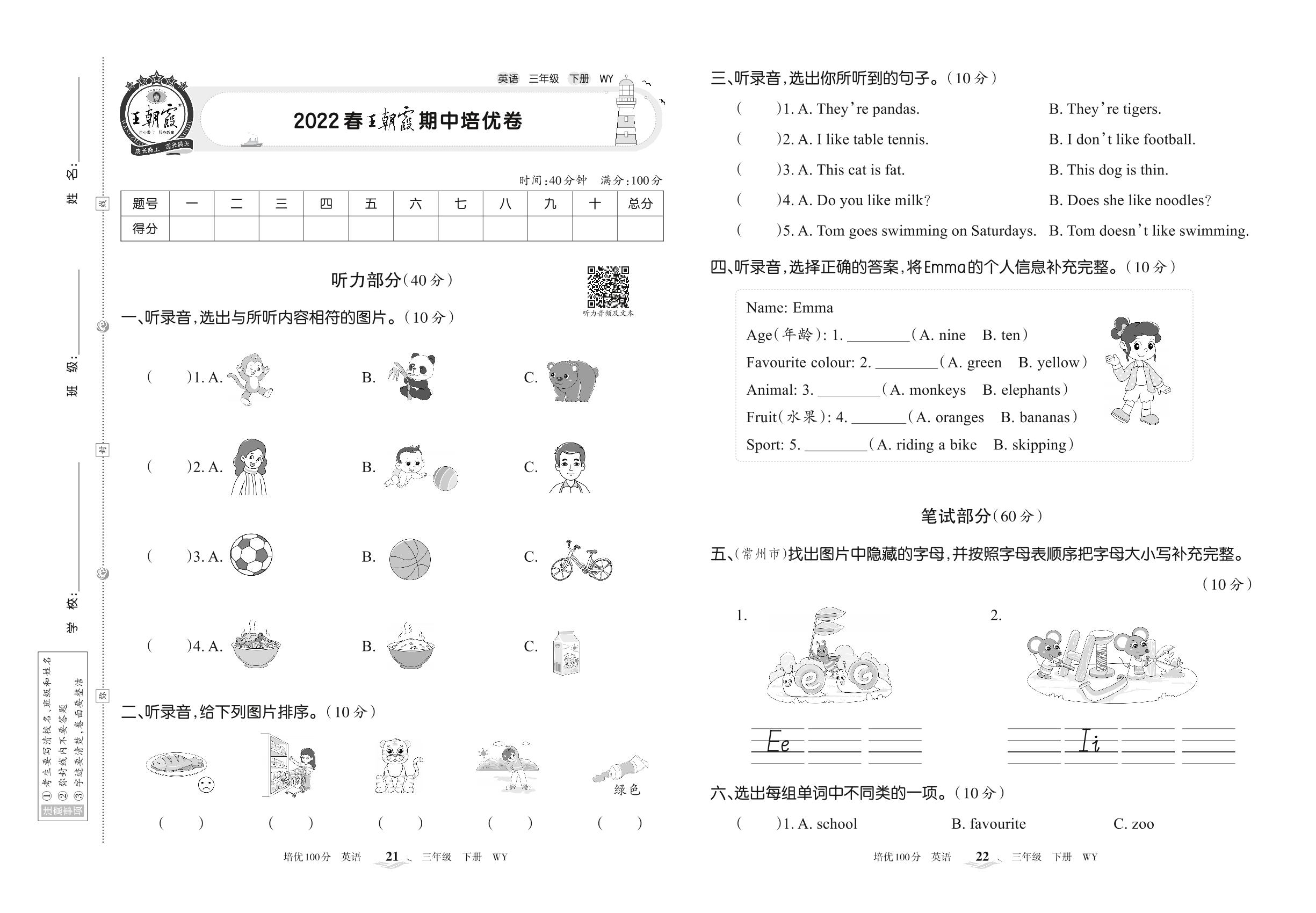 2022下册三年级英语外研版 王朝霞期中培优卷