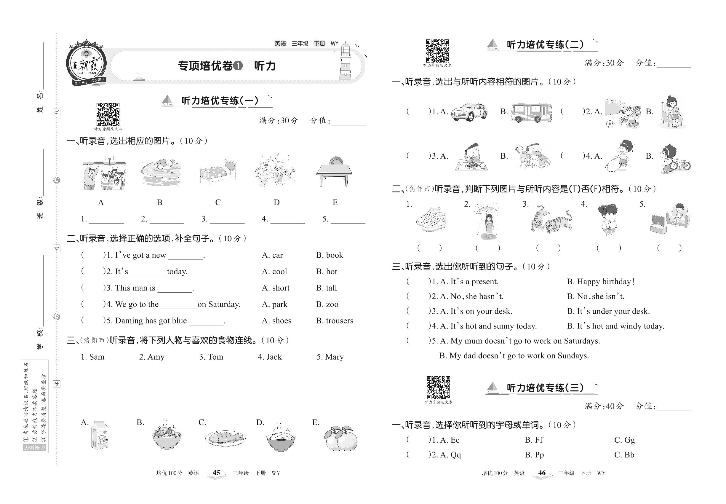 2022下册三年级英语外研版 专项培优卷1 听力