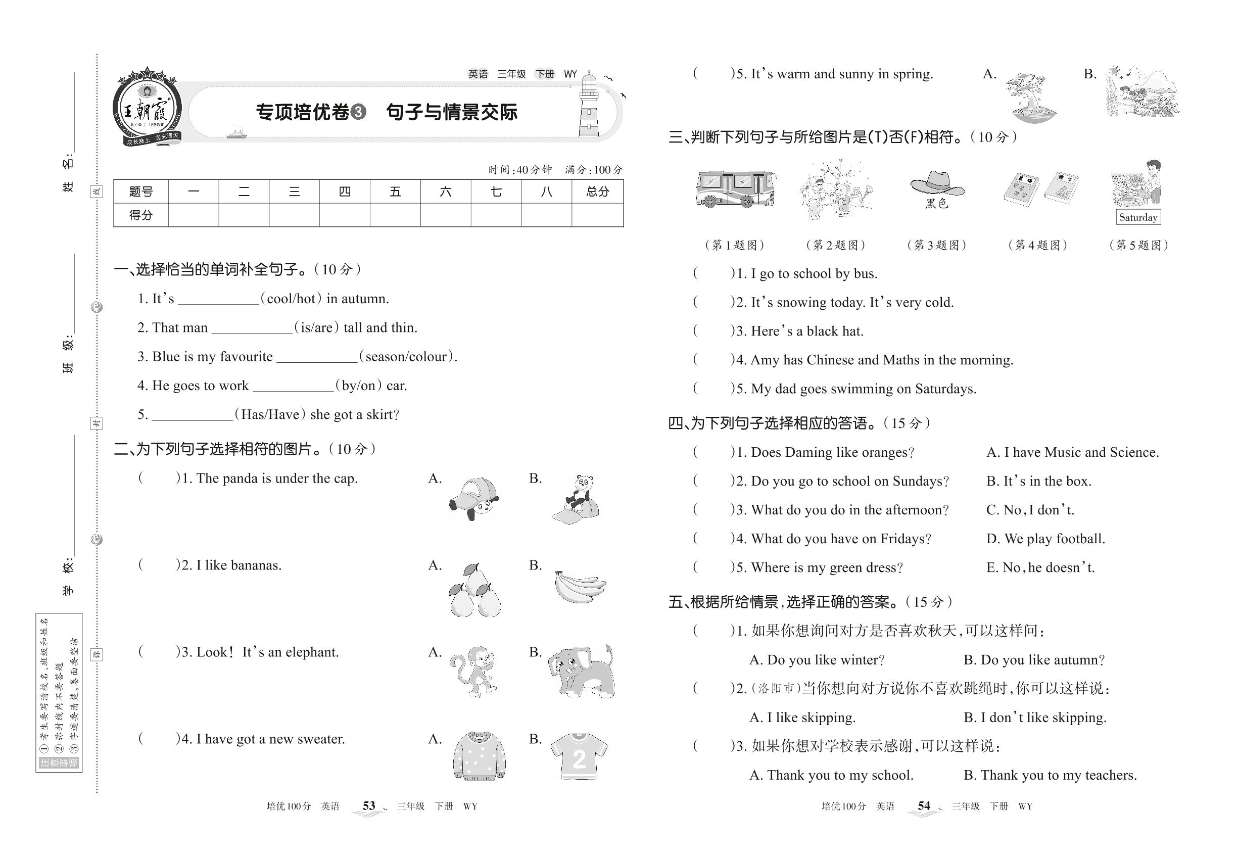 2022下册三年级英语外研版 专项培优卷3 句子与情景交际