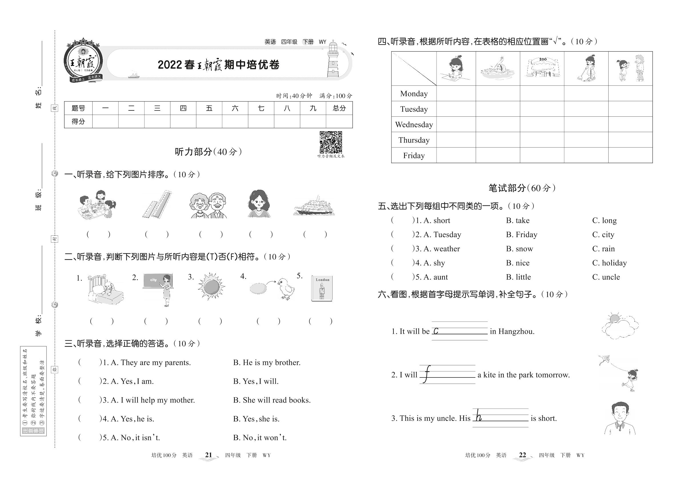 2022下册四年级英语外研版 王朝霞期中培优卷