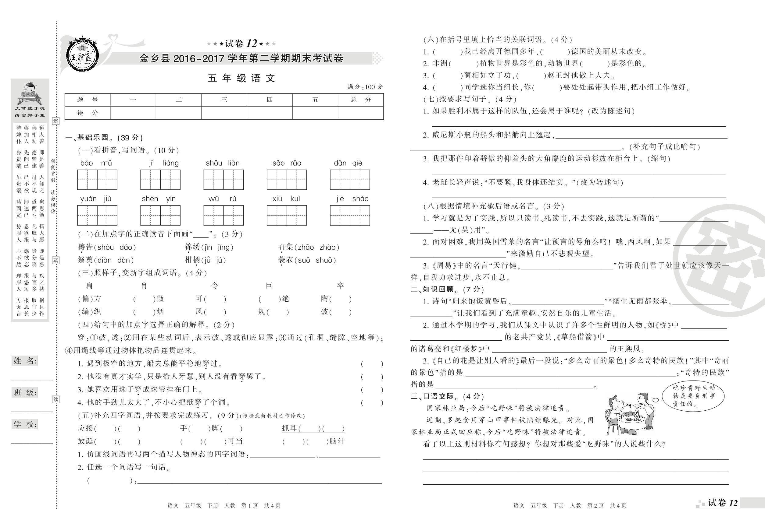2016-2017学年第二学期济宁市金乡县五年级语文试卷(人教版)【12】