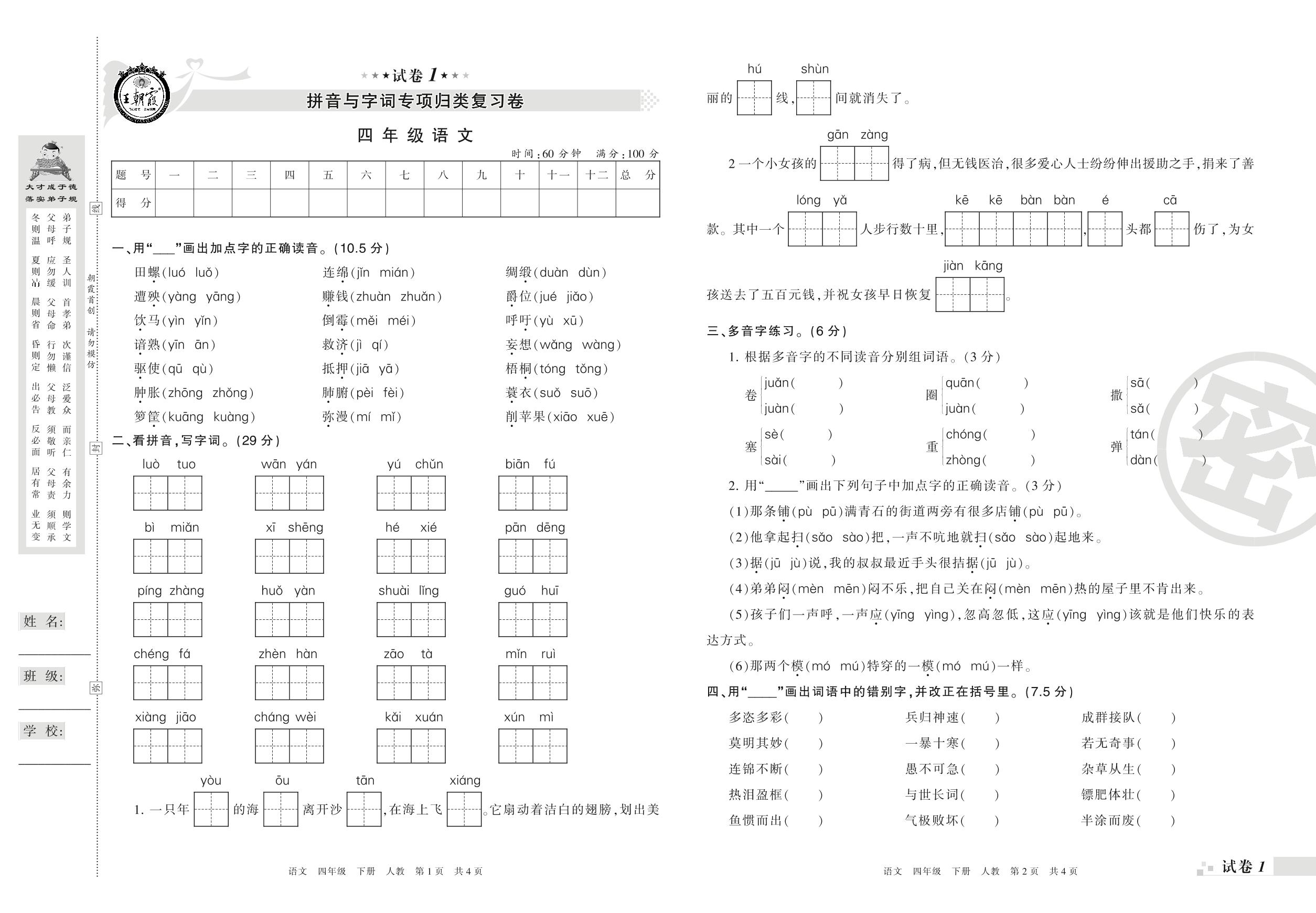 王朝霞期末专项卷——拼音与字词专项归类复习卷四年级下册语文(人教版)_R210801230745【1】