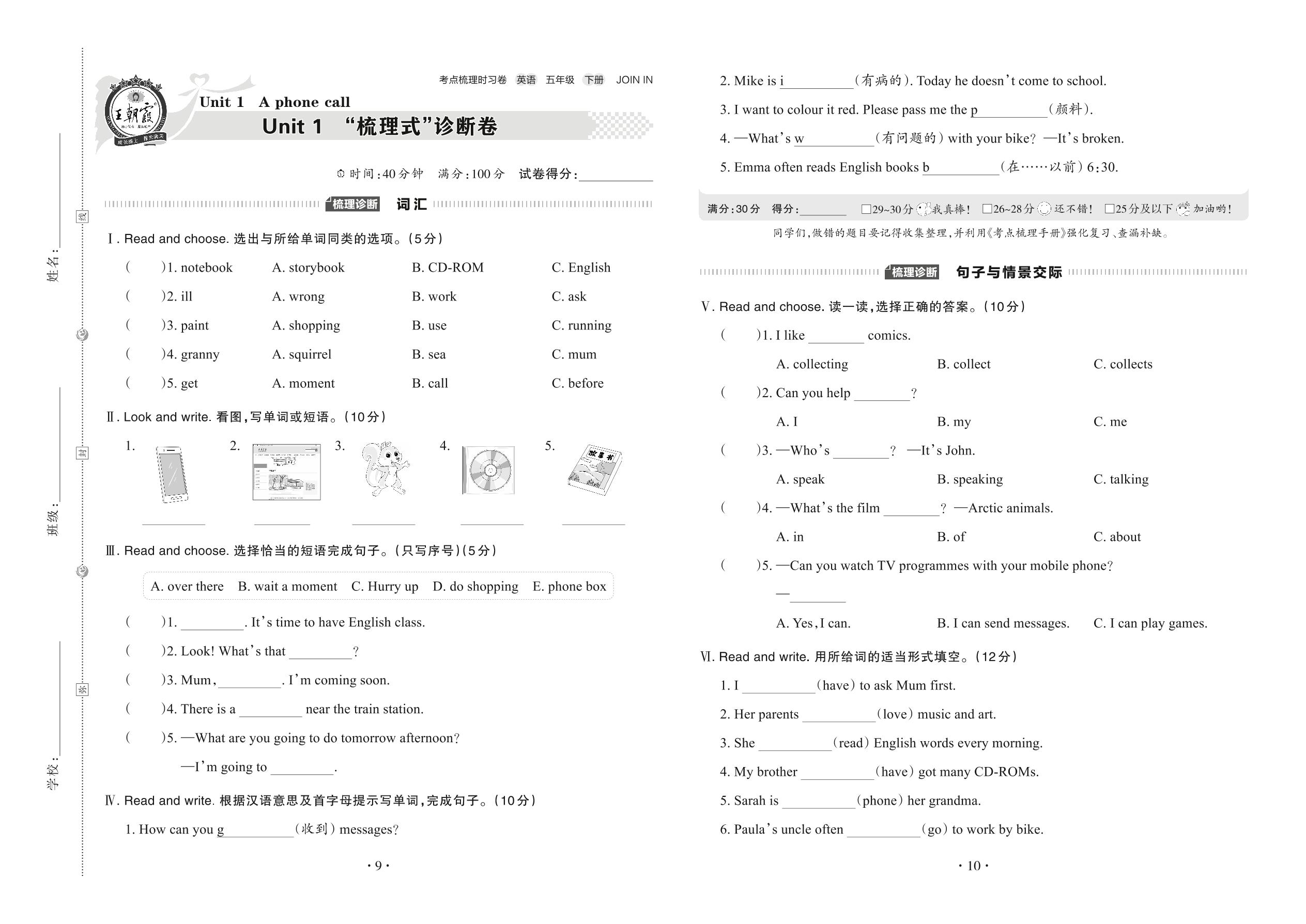 2022下册五年级英语剑桥版 Unit 1 “梳理式”诊断卷