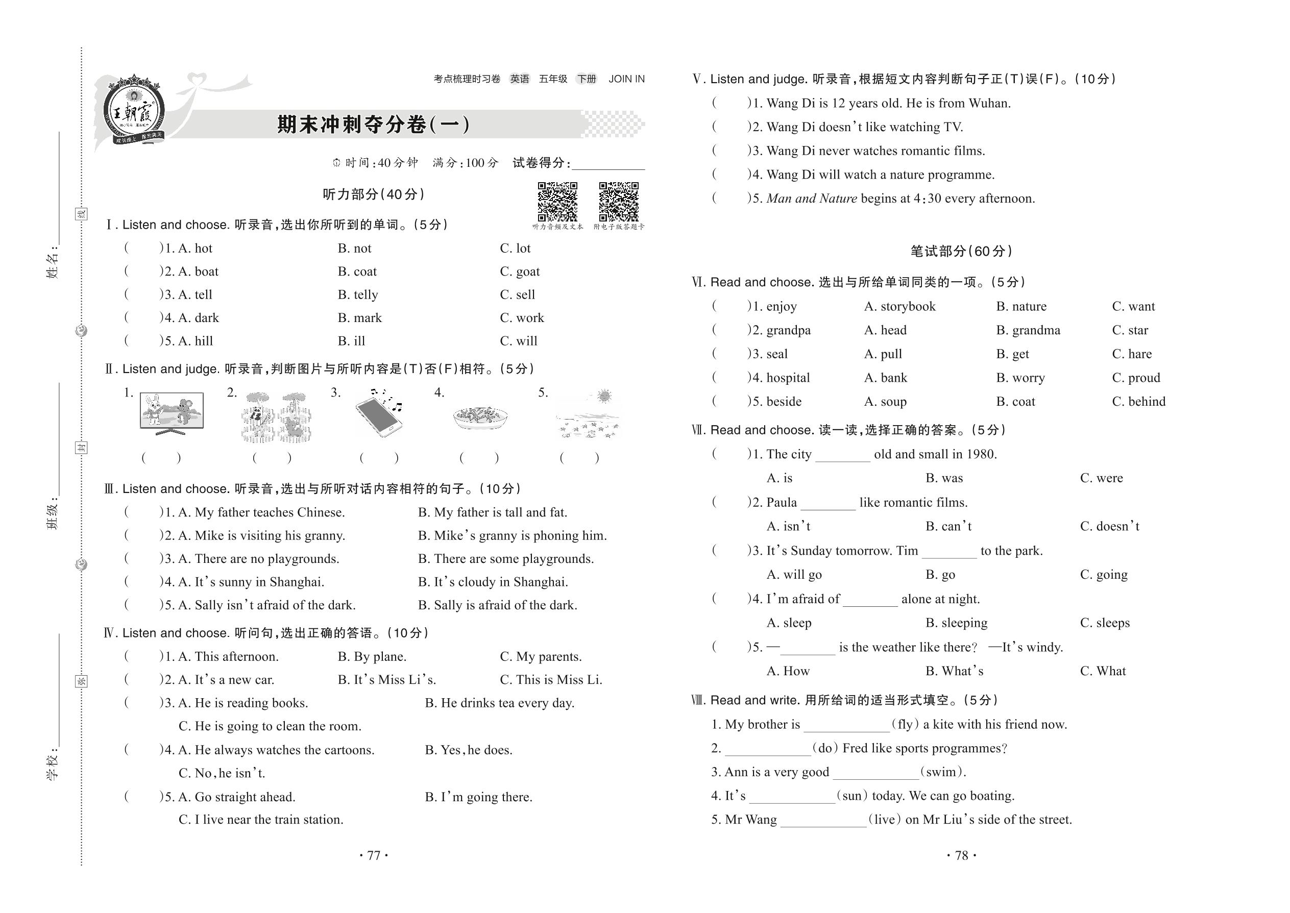 2022下册五年级英语剑桥版 期末冲刺夺分卷(一)
