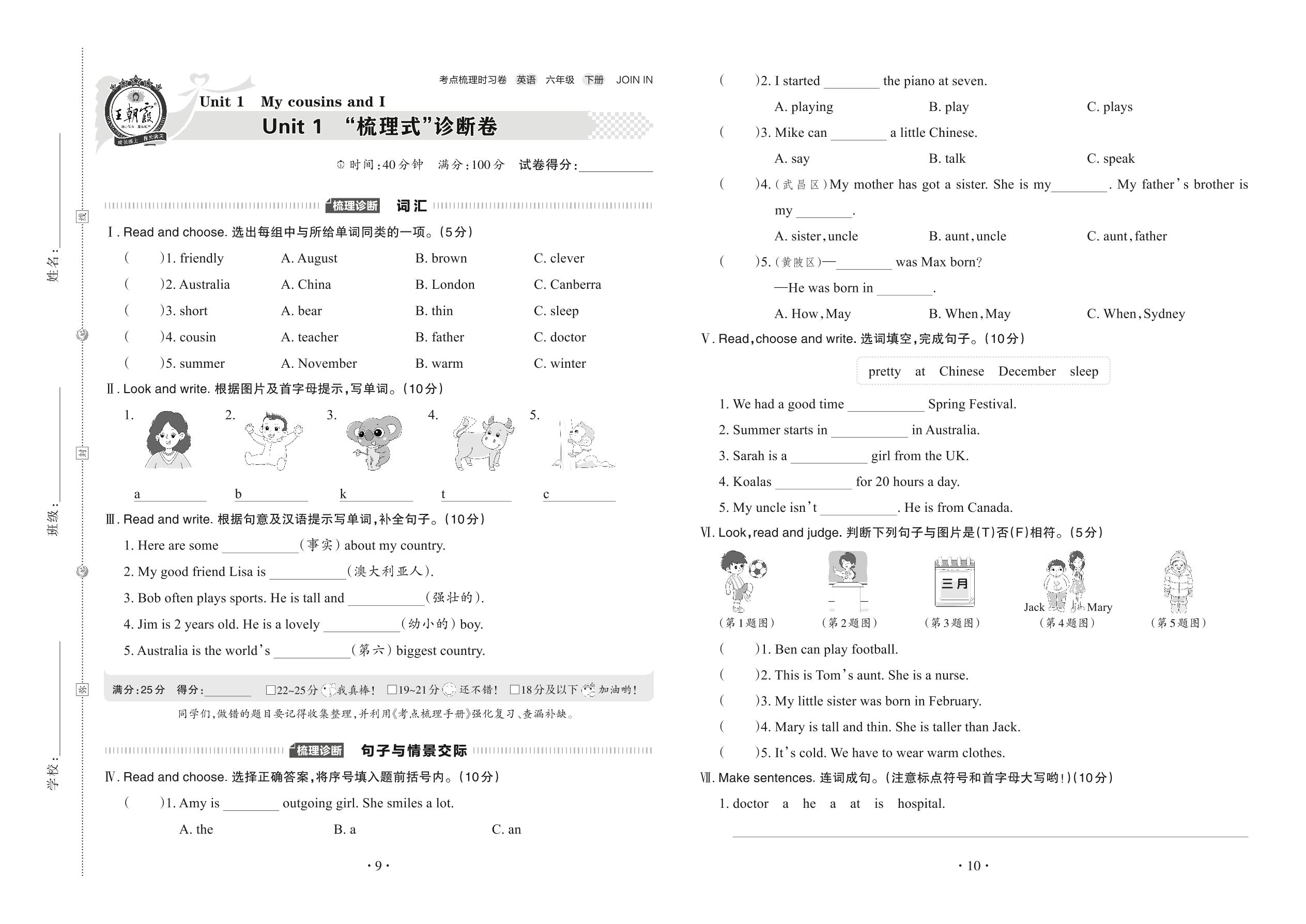 2022下册六年级英语剑桥版 Unit 1 “梳理式”诊断卷