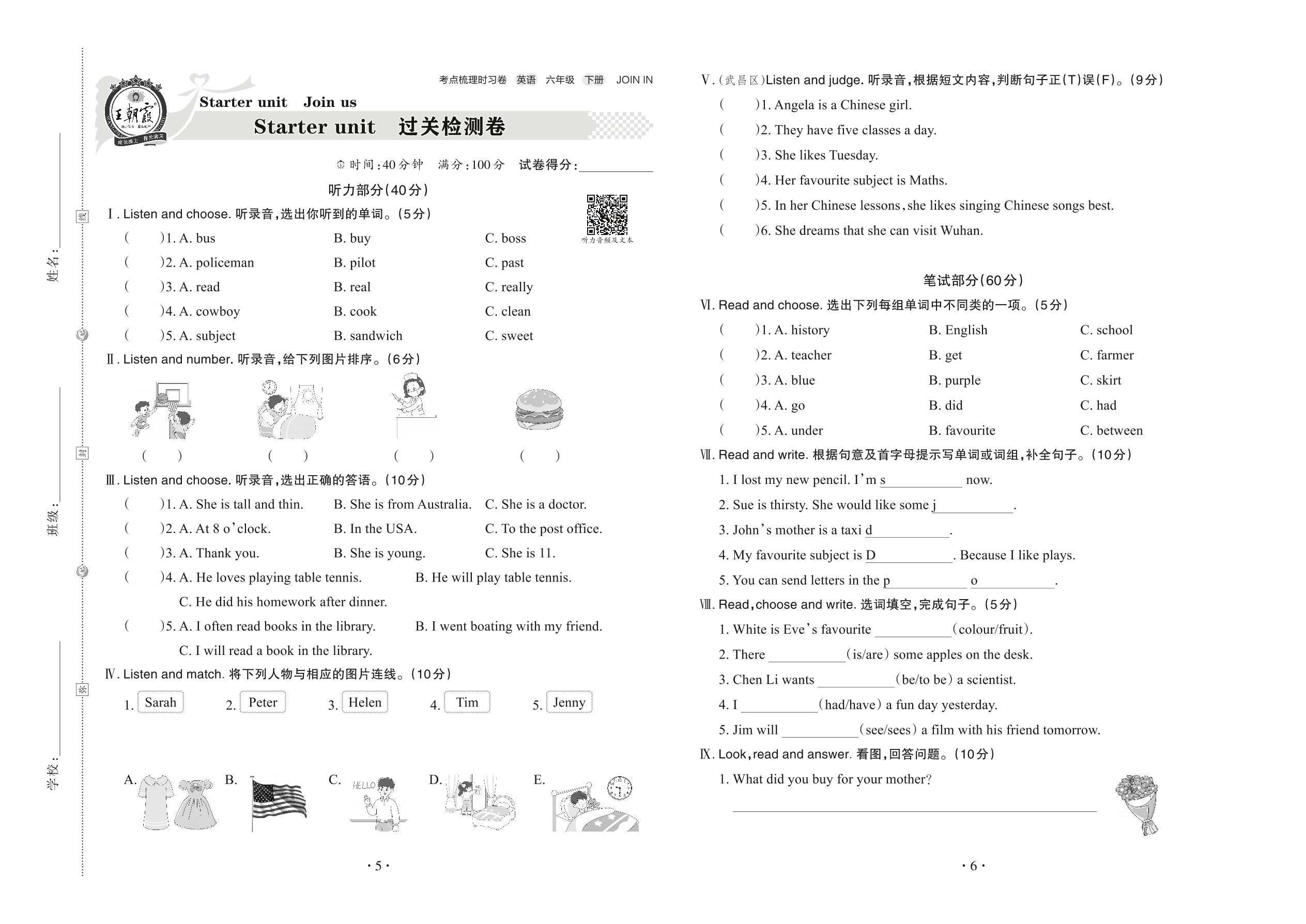 2022下册六年级英语剑桥版 Starter unit 过关检测卷
