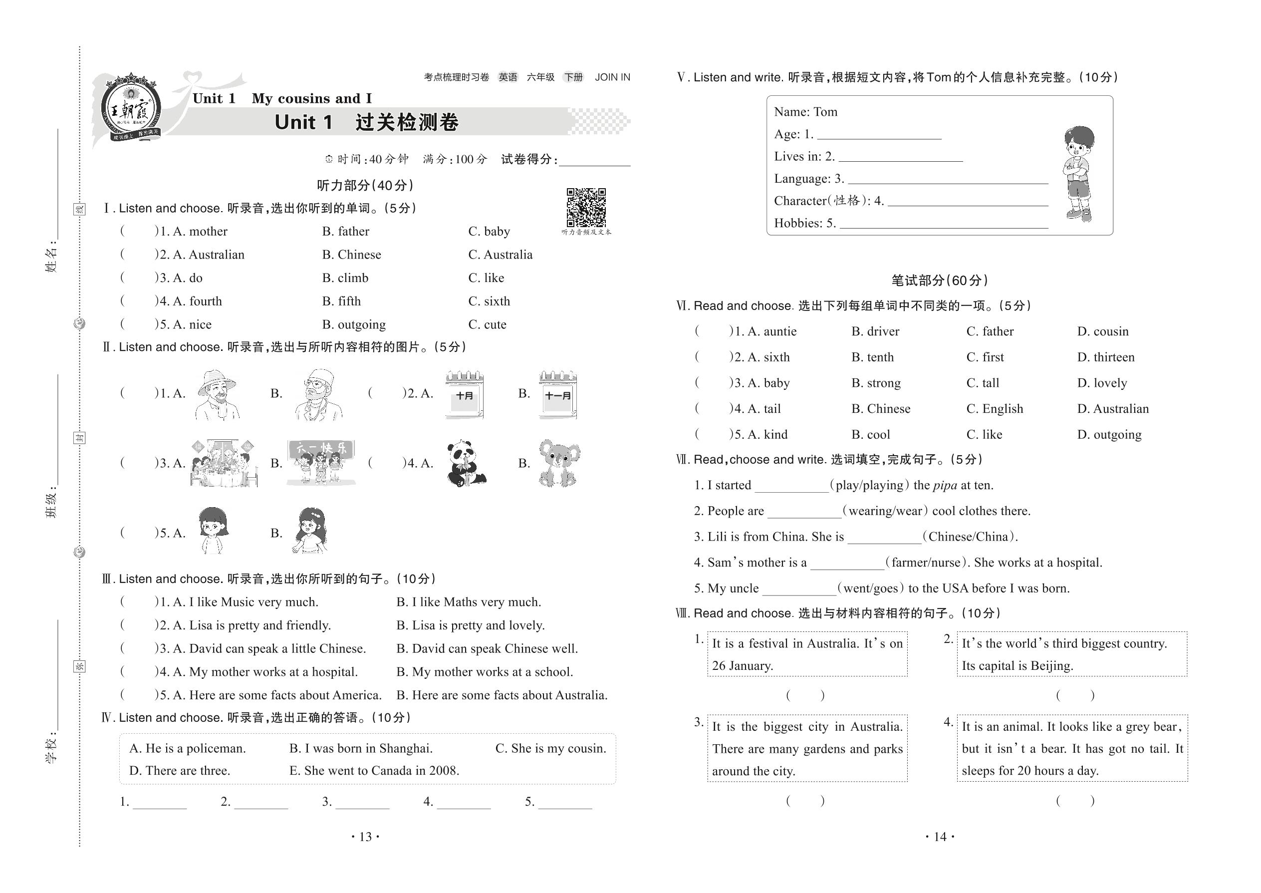 2022下册六年级英语剑桥版 Unit 1 过关检测卷