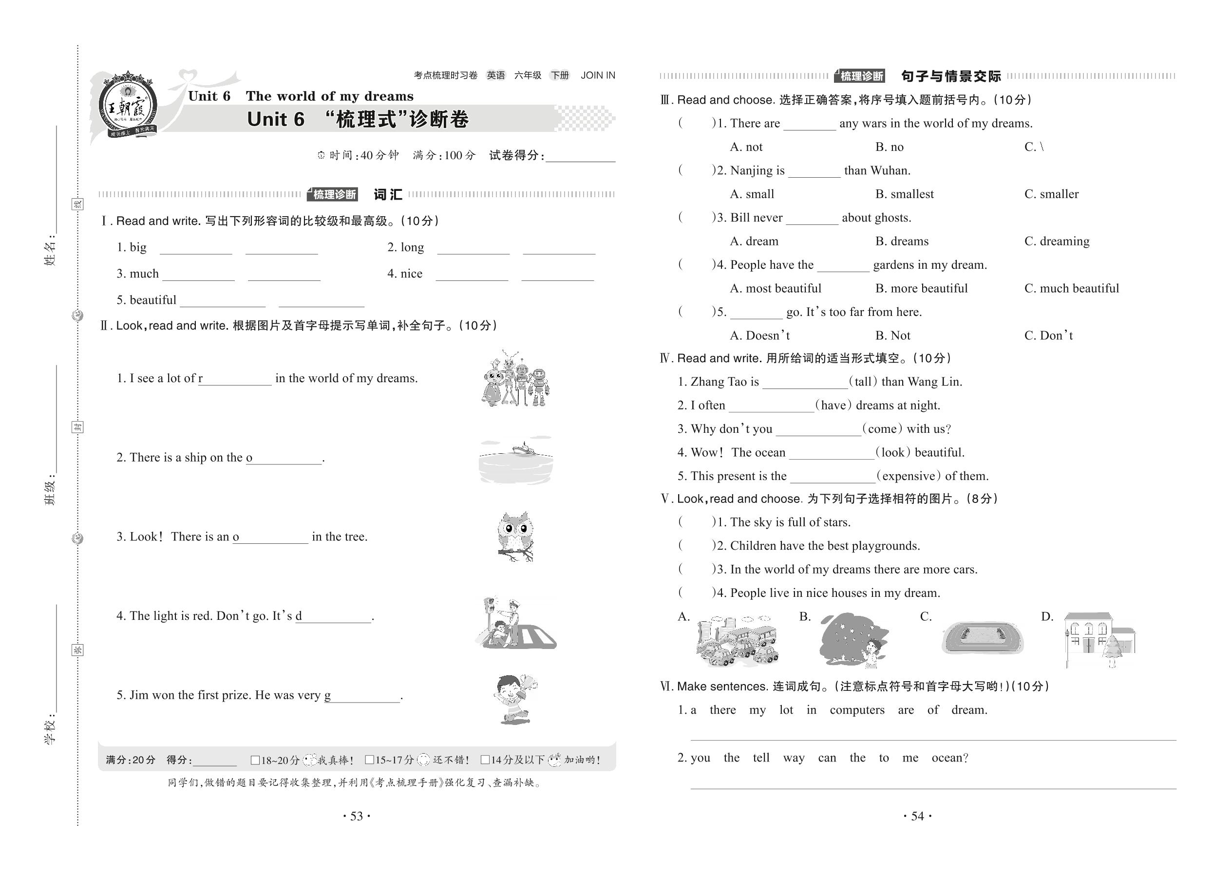2022下册六年级英语剑桥版 Unit 6 “梳理式”诊断卷