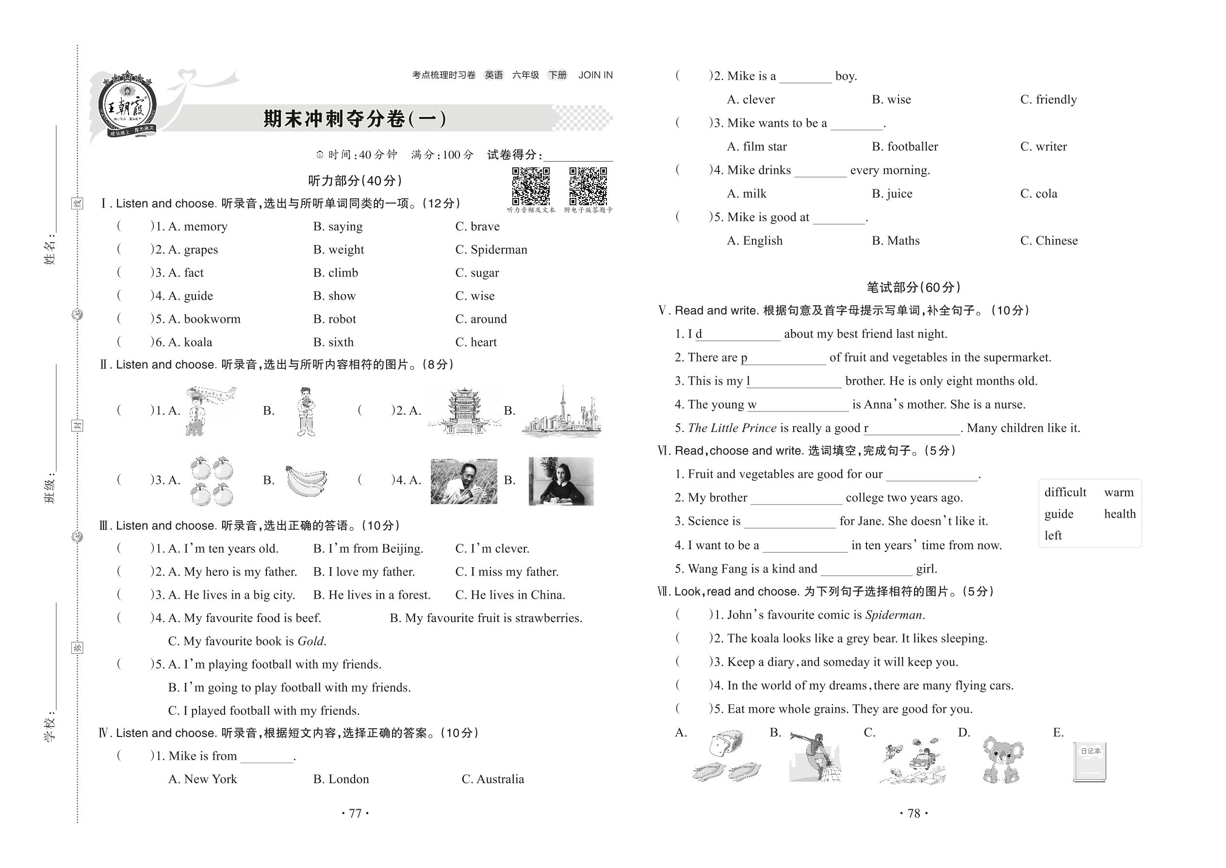 六年级英语剑桥版下册期末卷