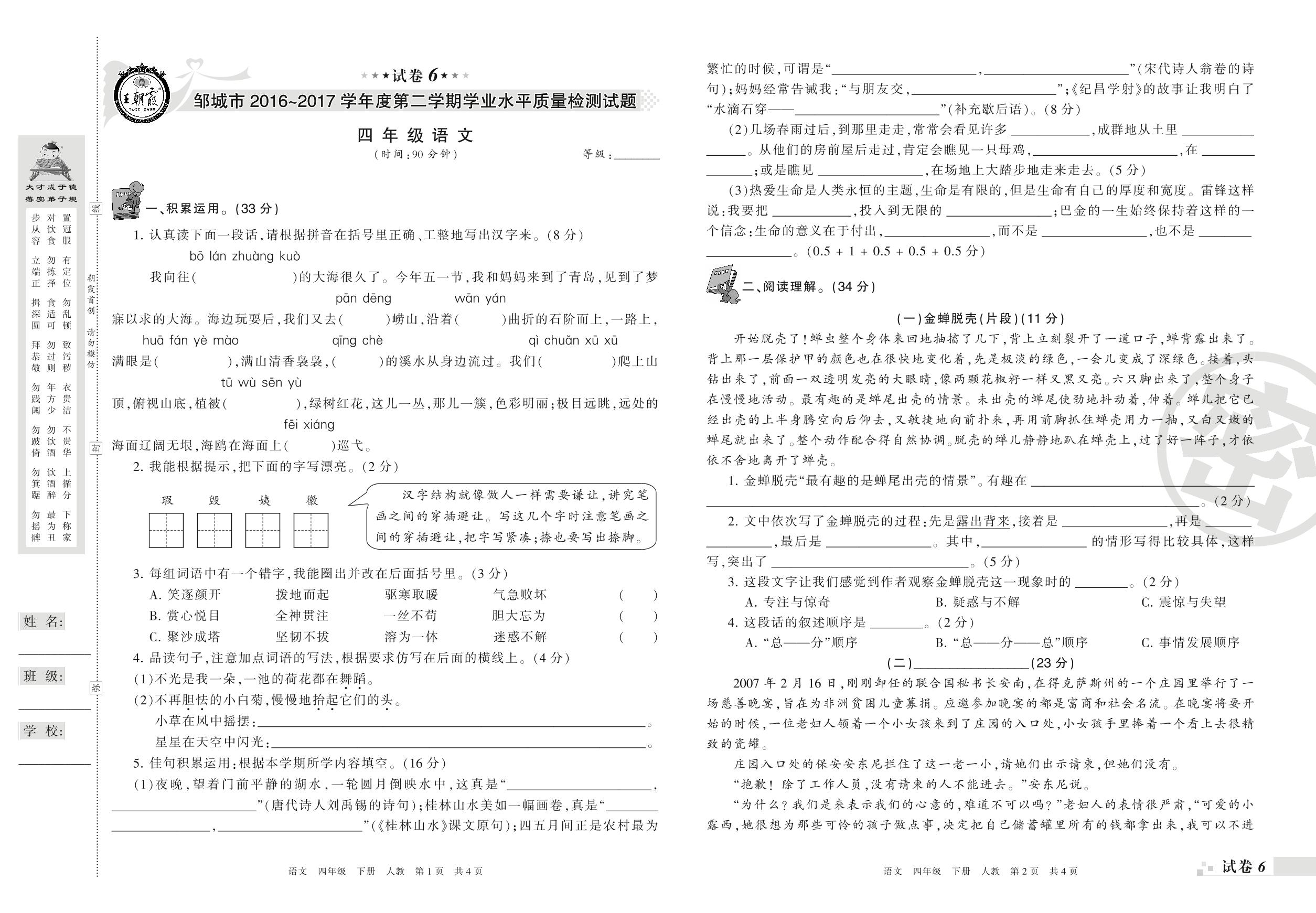 2016-2017学年第二学期邹城市四年级语文试卷(人教版)【6】