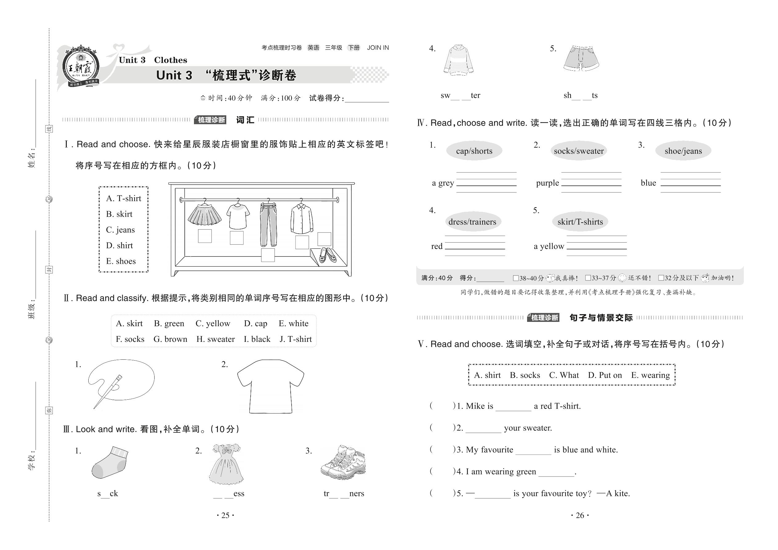 2022下册三年级英语剑桥版 Unit 3 “梳理式”诊断卷