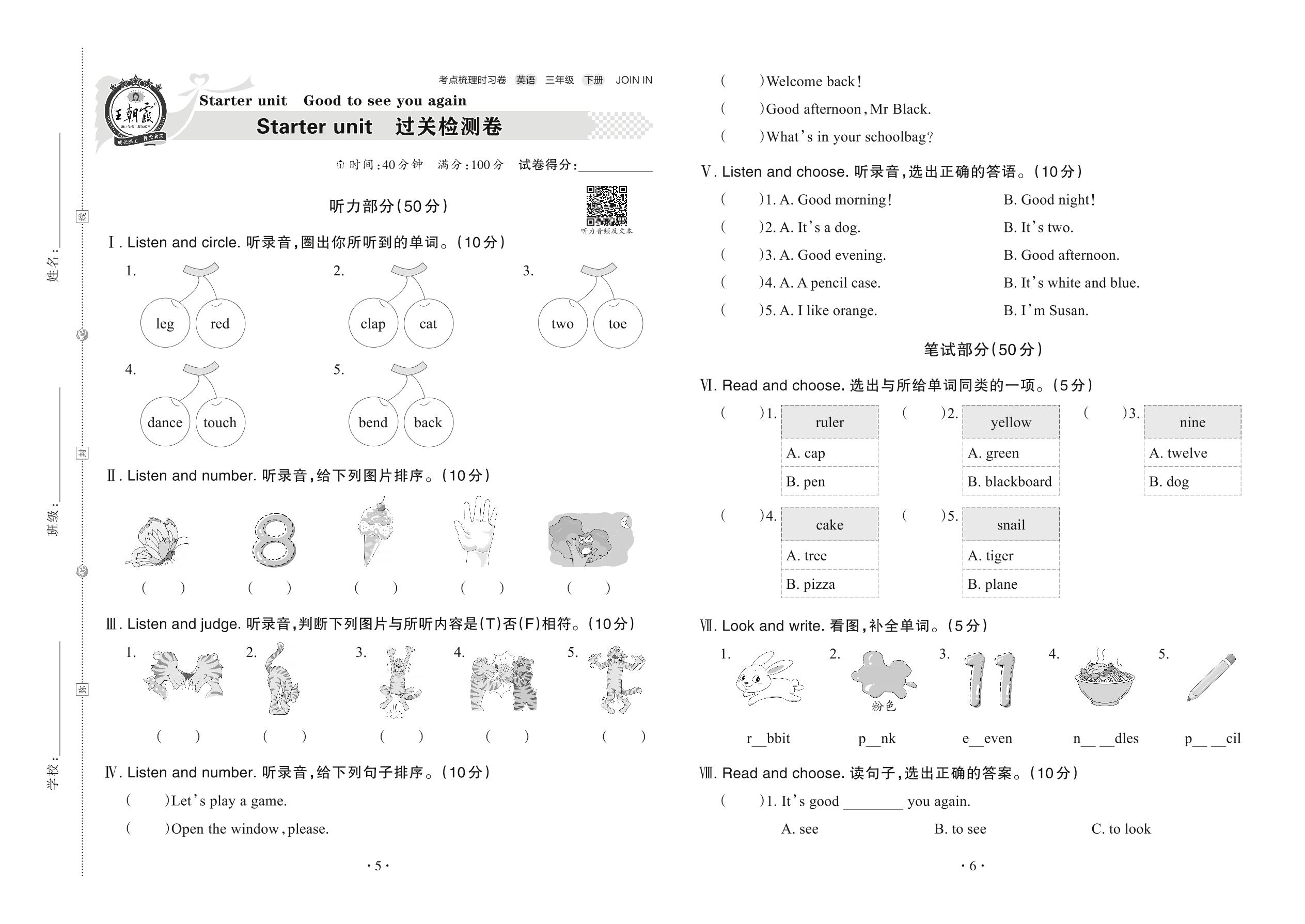 2022下册三年级英语剑桥版 Starter unit 过关检测卷