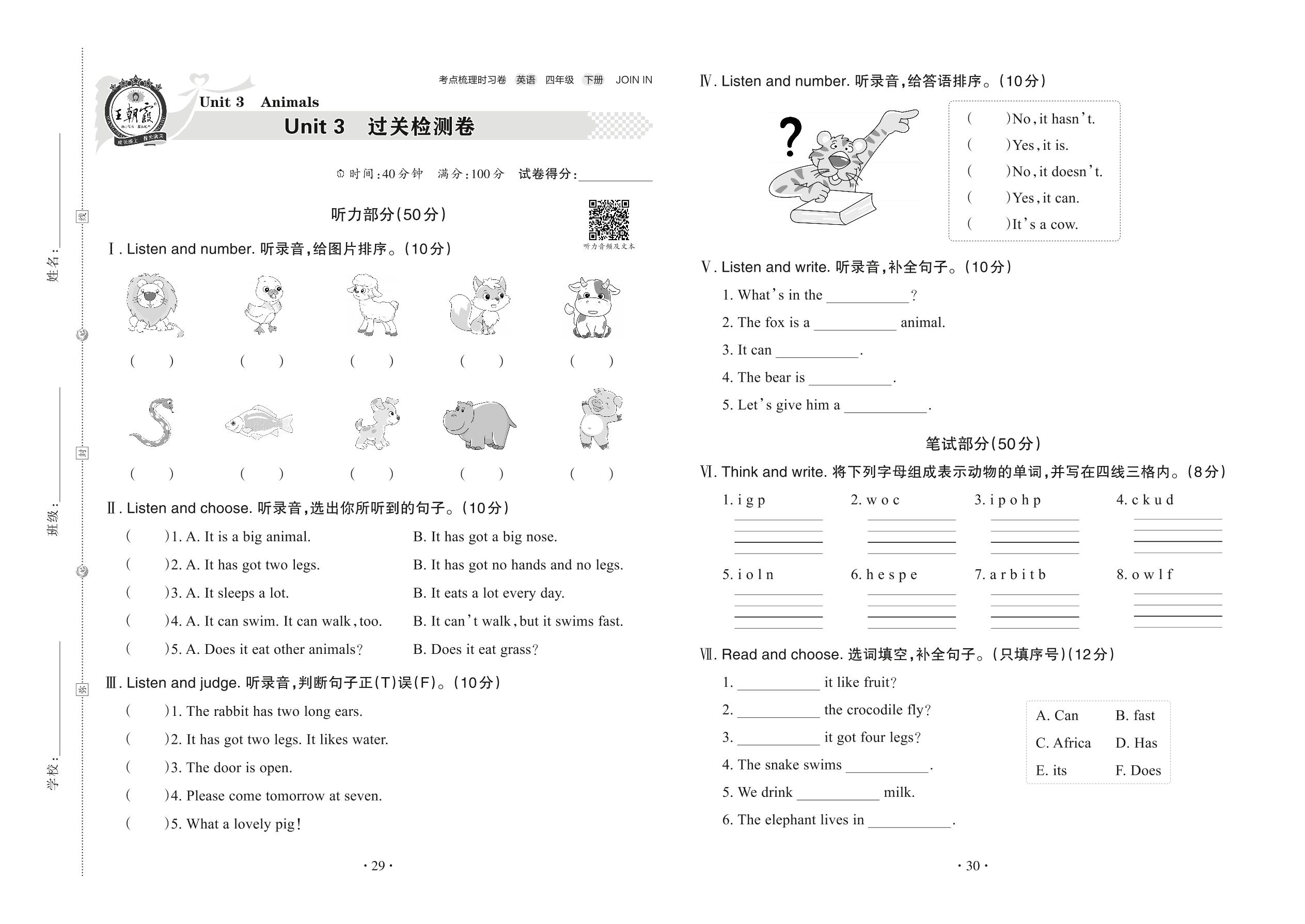 2022下册四年级英语剑桥版 Unit 3 过关检测卷