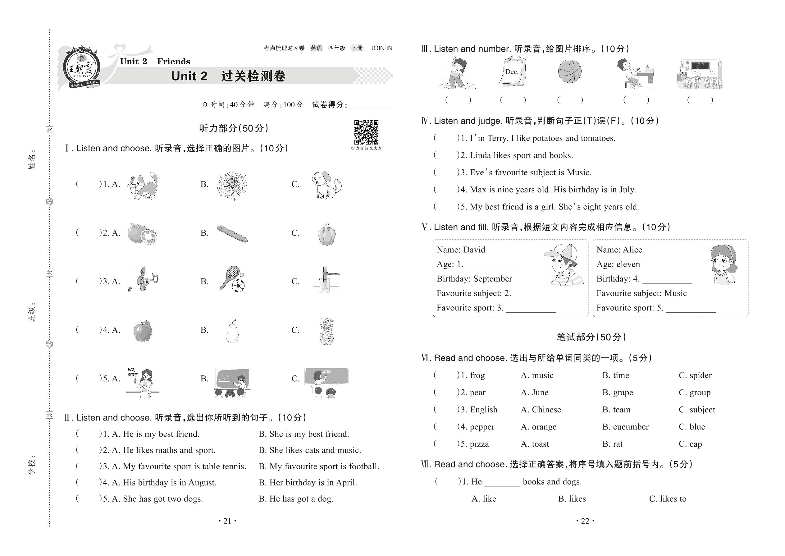 2022下册四年级英语剑桥版 Unit 2 过关检测卷