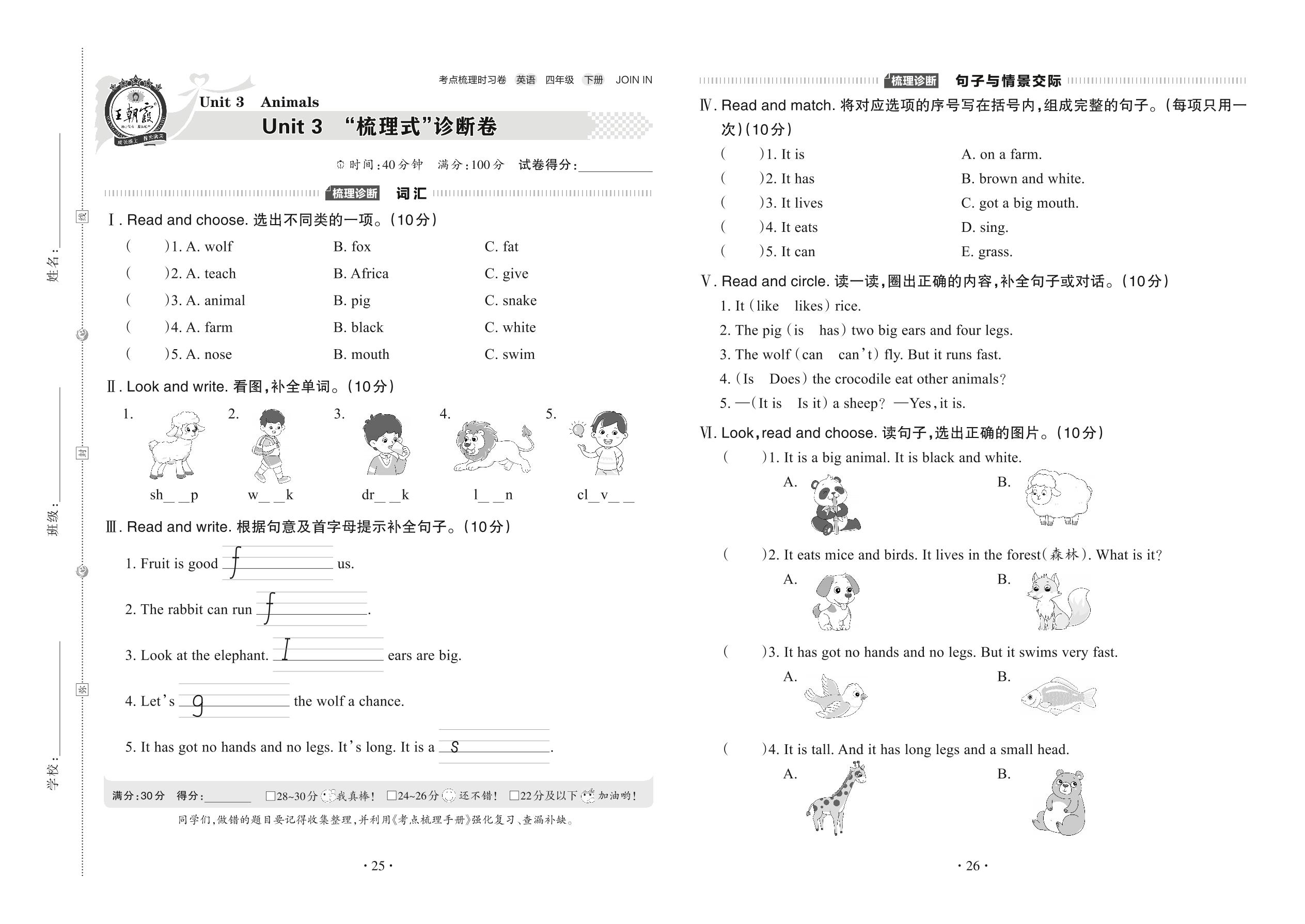 2022下册四年级英语剑桥版 Unit 3 “梳理式”诊断卷