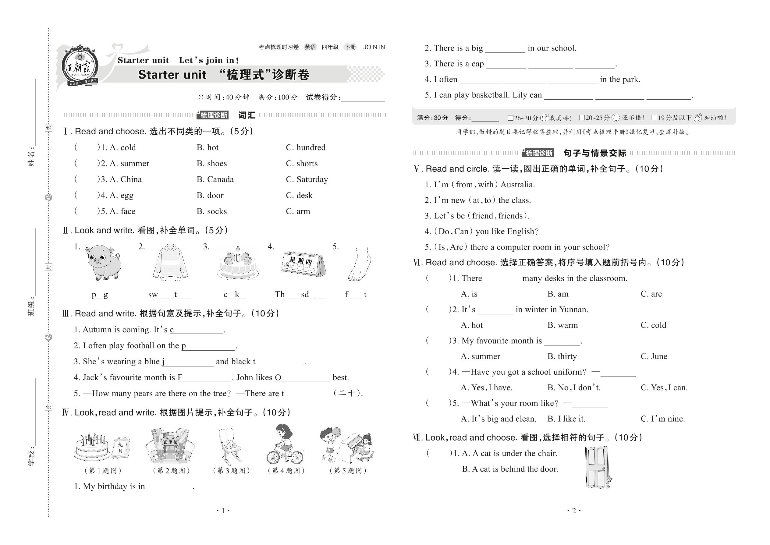 2022下册四年级英语剑桥版 Starter unit “梳理式”诊断卷