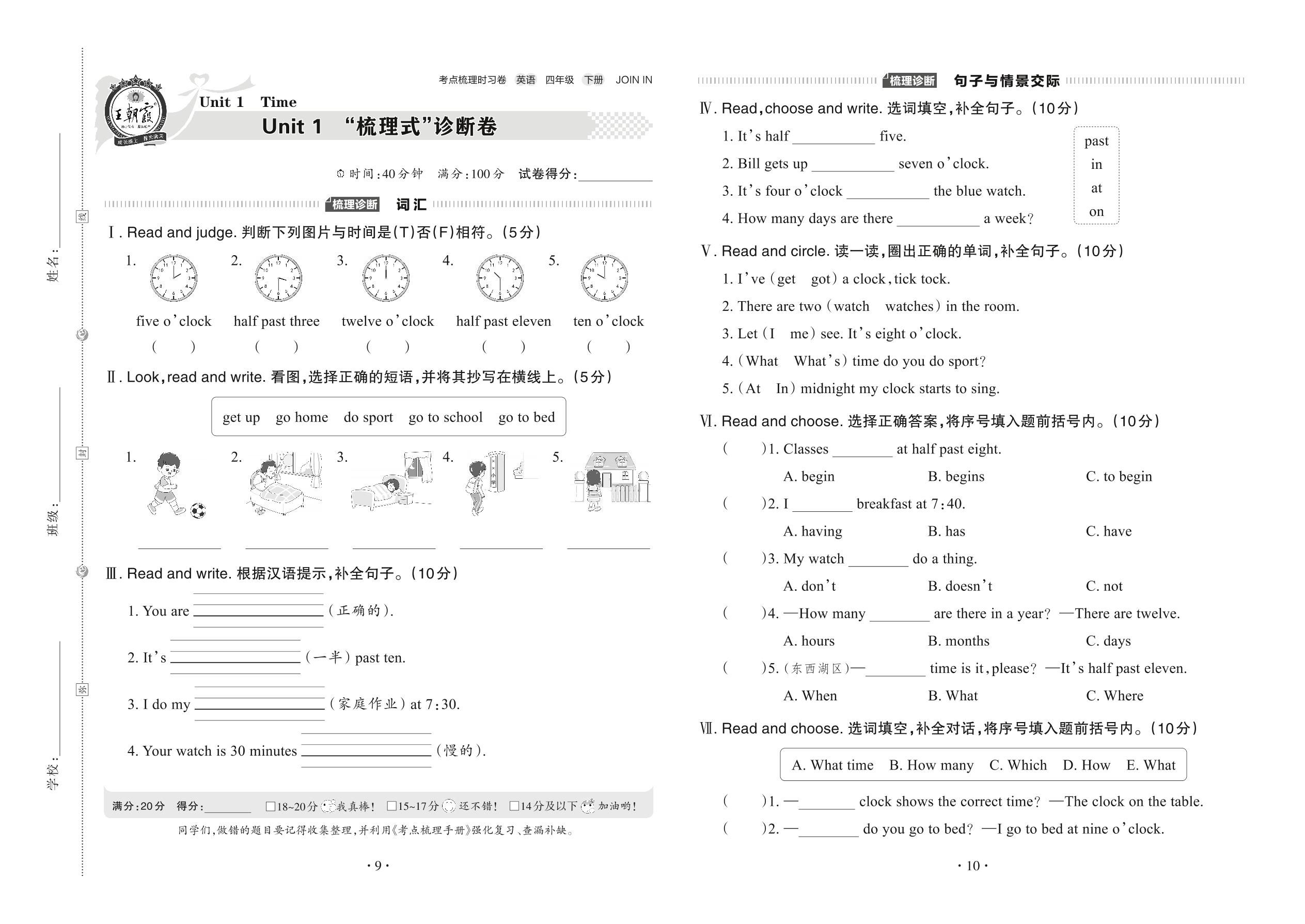 2022下册四年级英语剑桥版 Unit 1 “梳理式”诊断卷