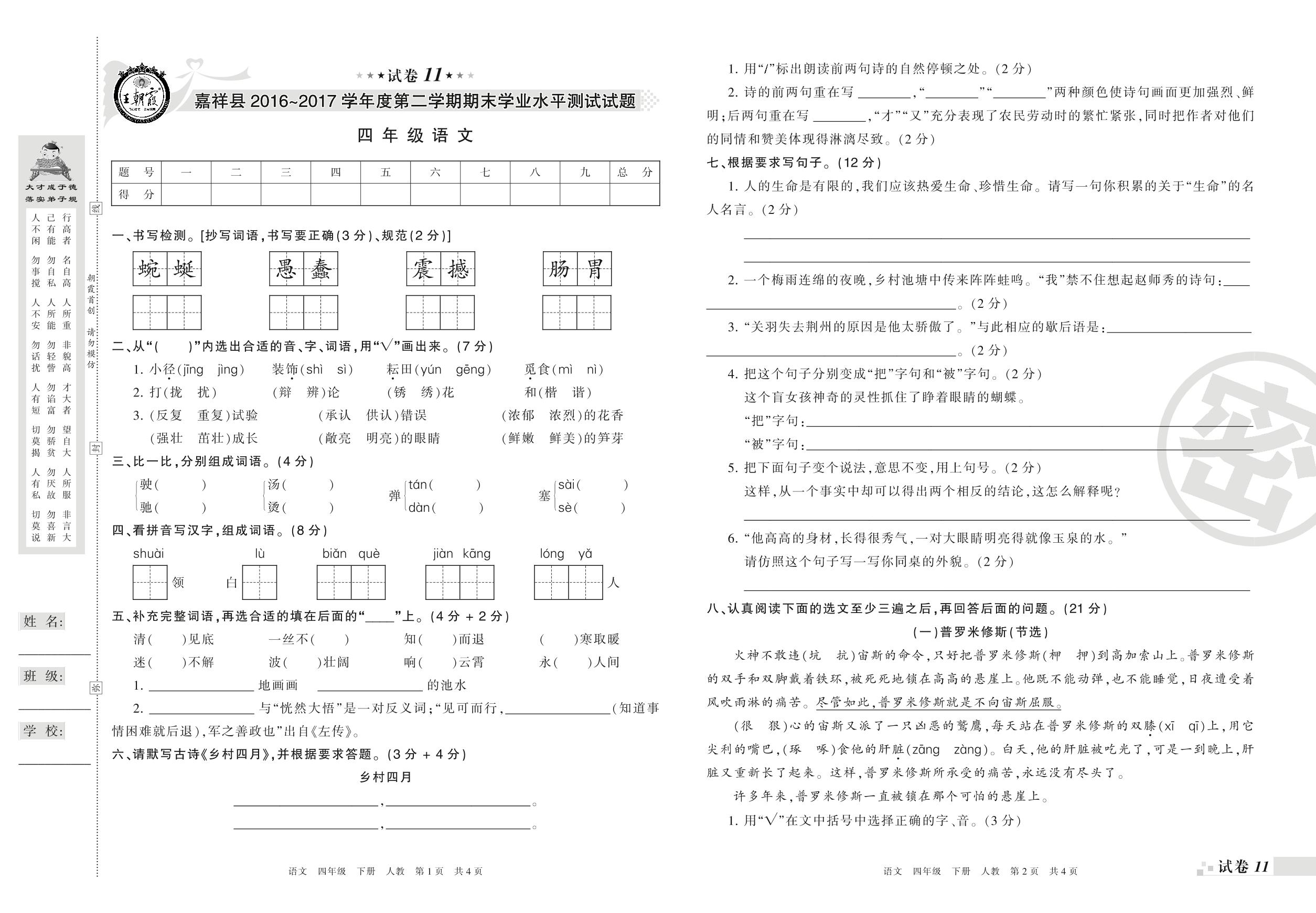 四年级语文人教版下册期末卷