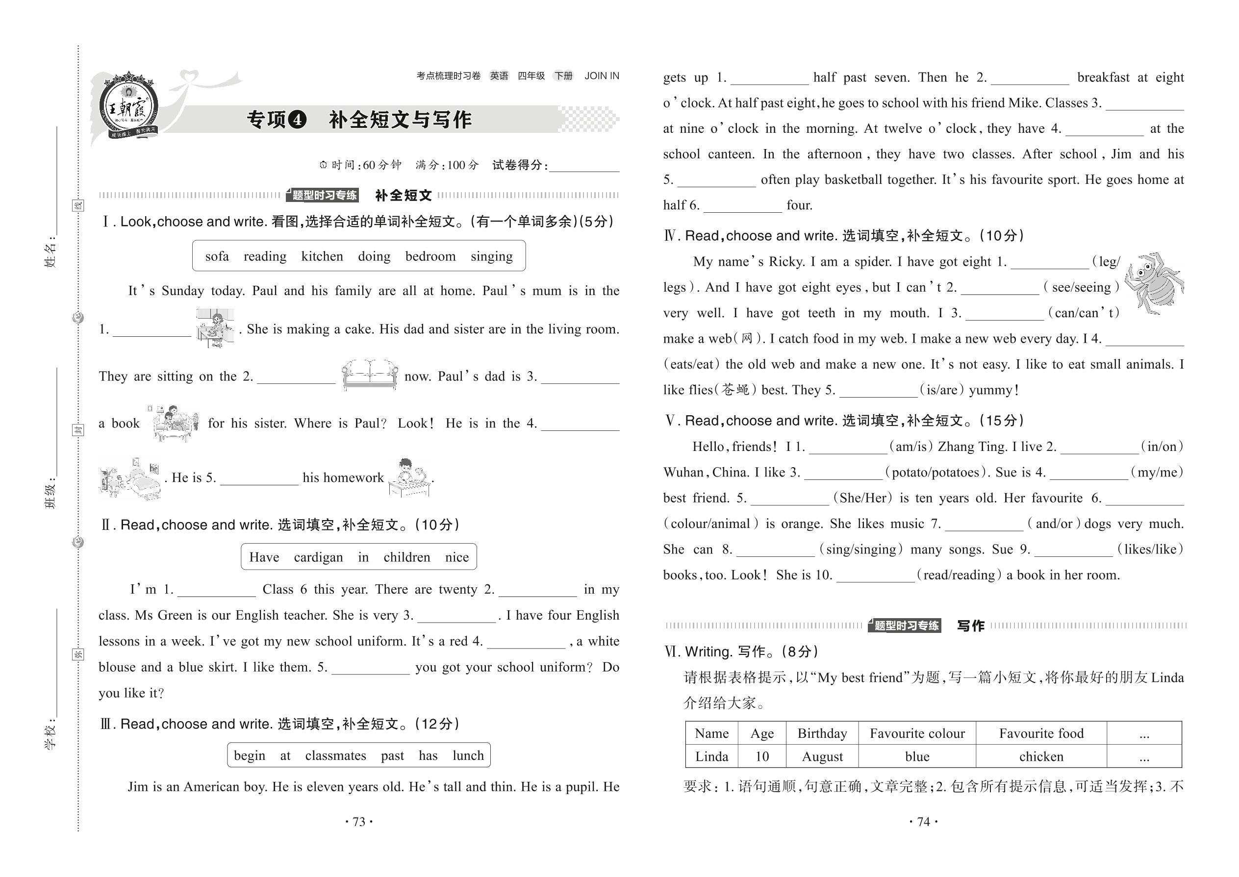 2022下册四年级英语剑桥版 专项4 补全短文与写作