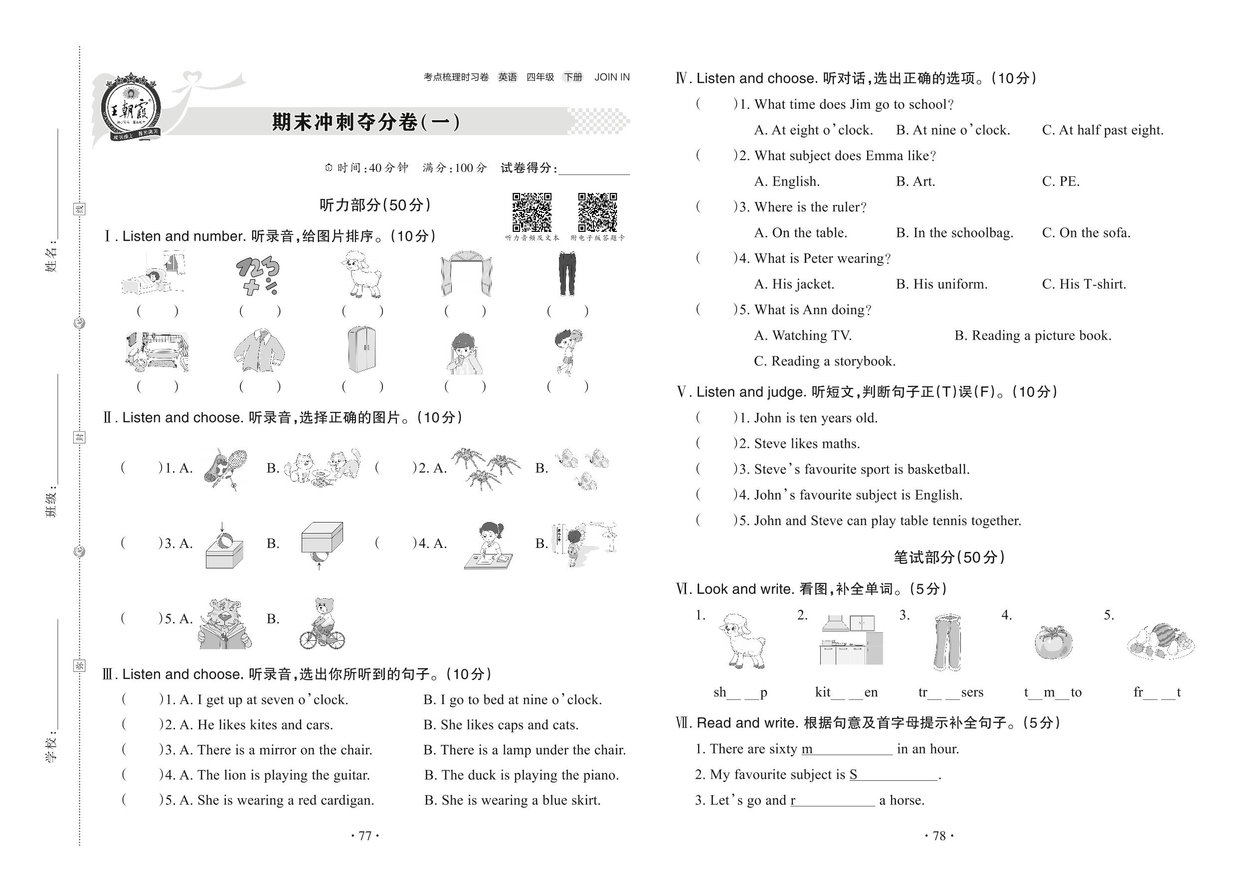 2022下册四年级英语剑桥版 期末冲刺夺分卷(一)
