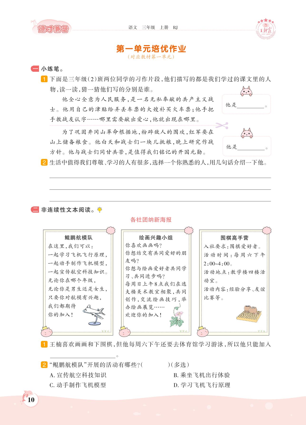 2021上册三年级语文人教版 第一单元——第一单元培优作业