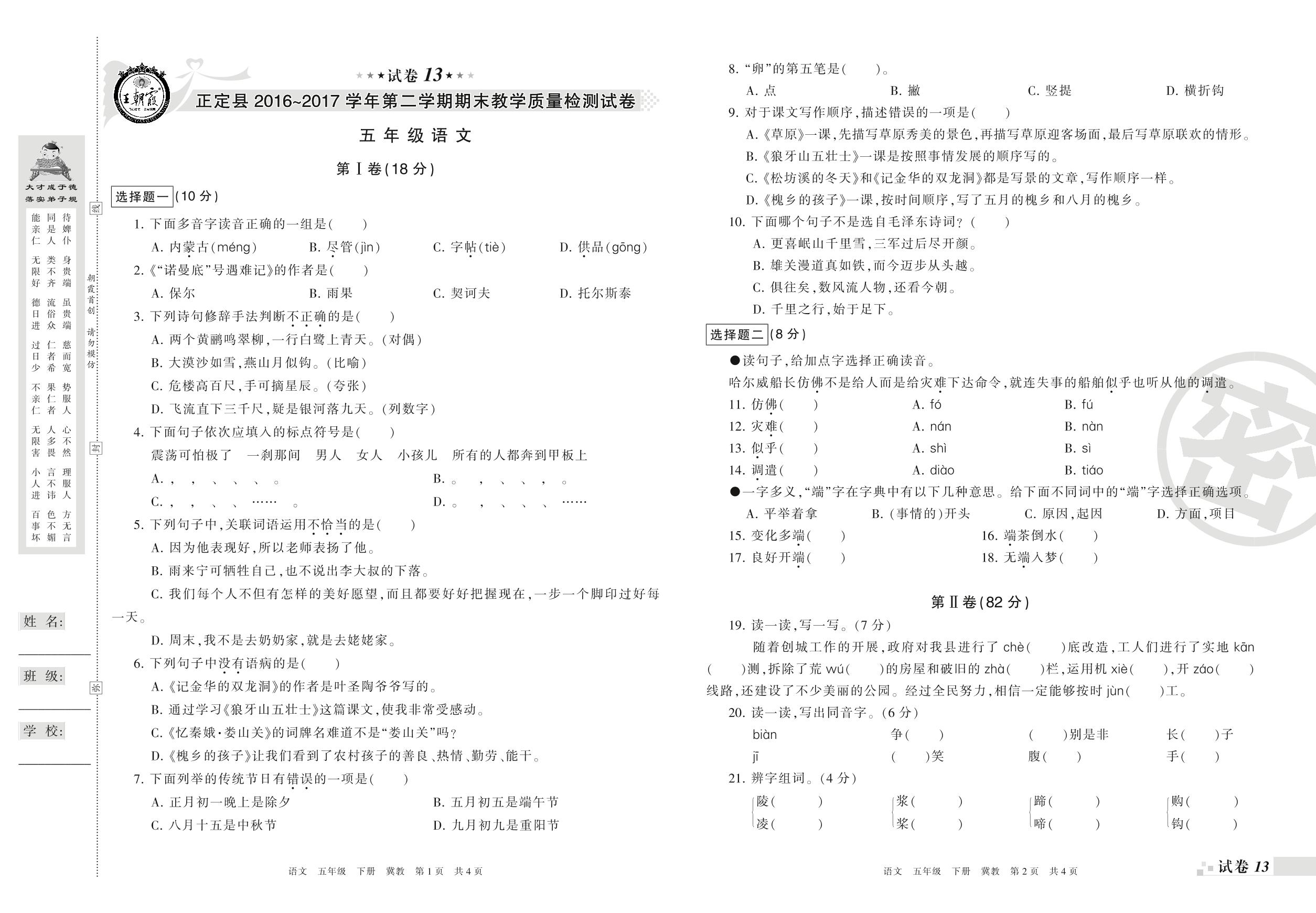 2016-2017学年第二学期石家庄市正定县五年级语文试卷(冀教版)【13】