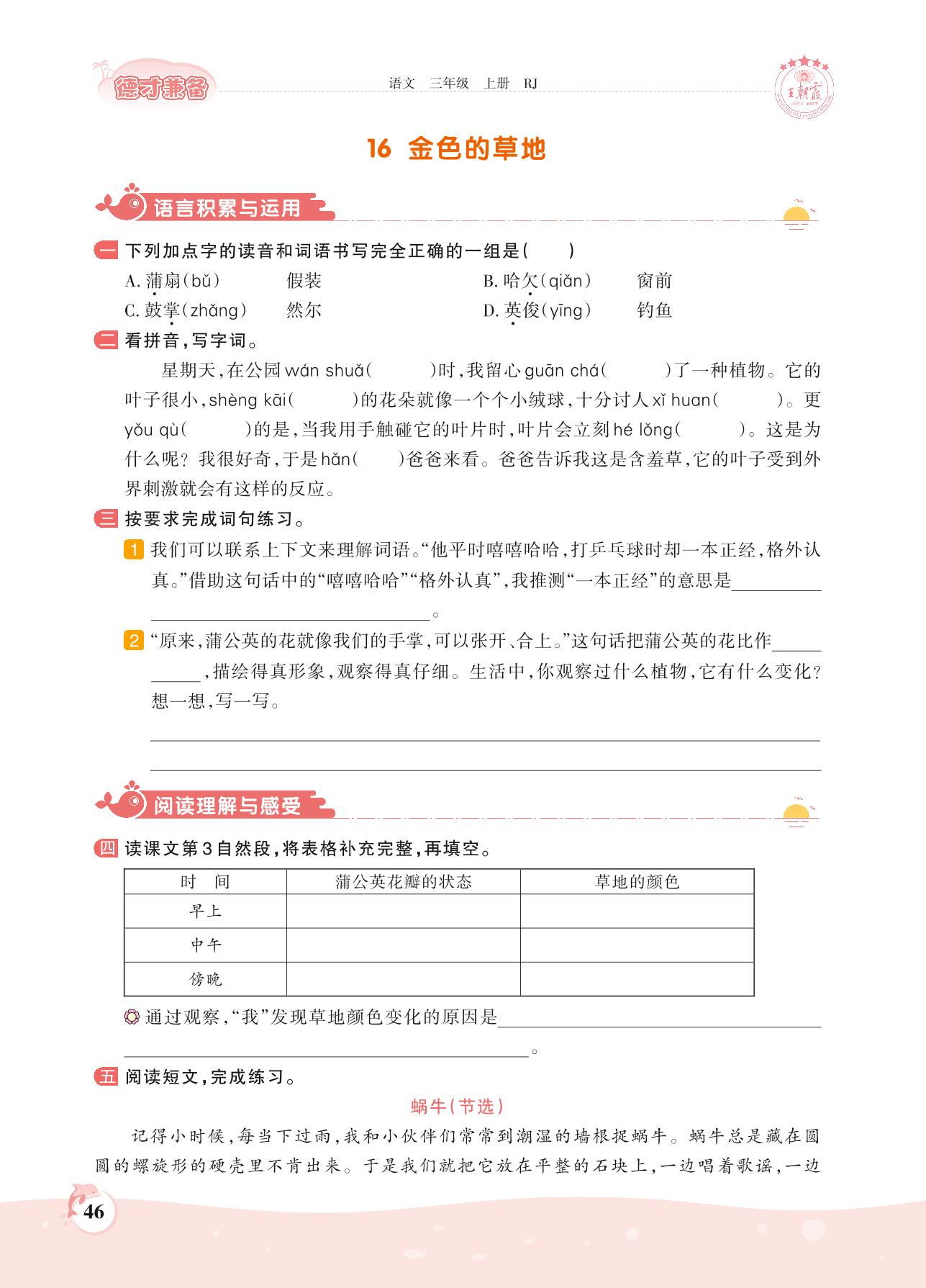 2021上册三年级语文人教版 第五单元——16 金色的草地