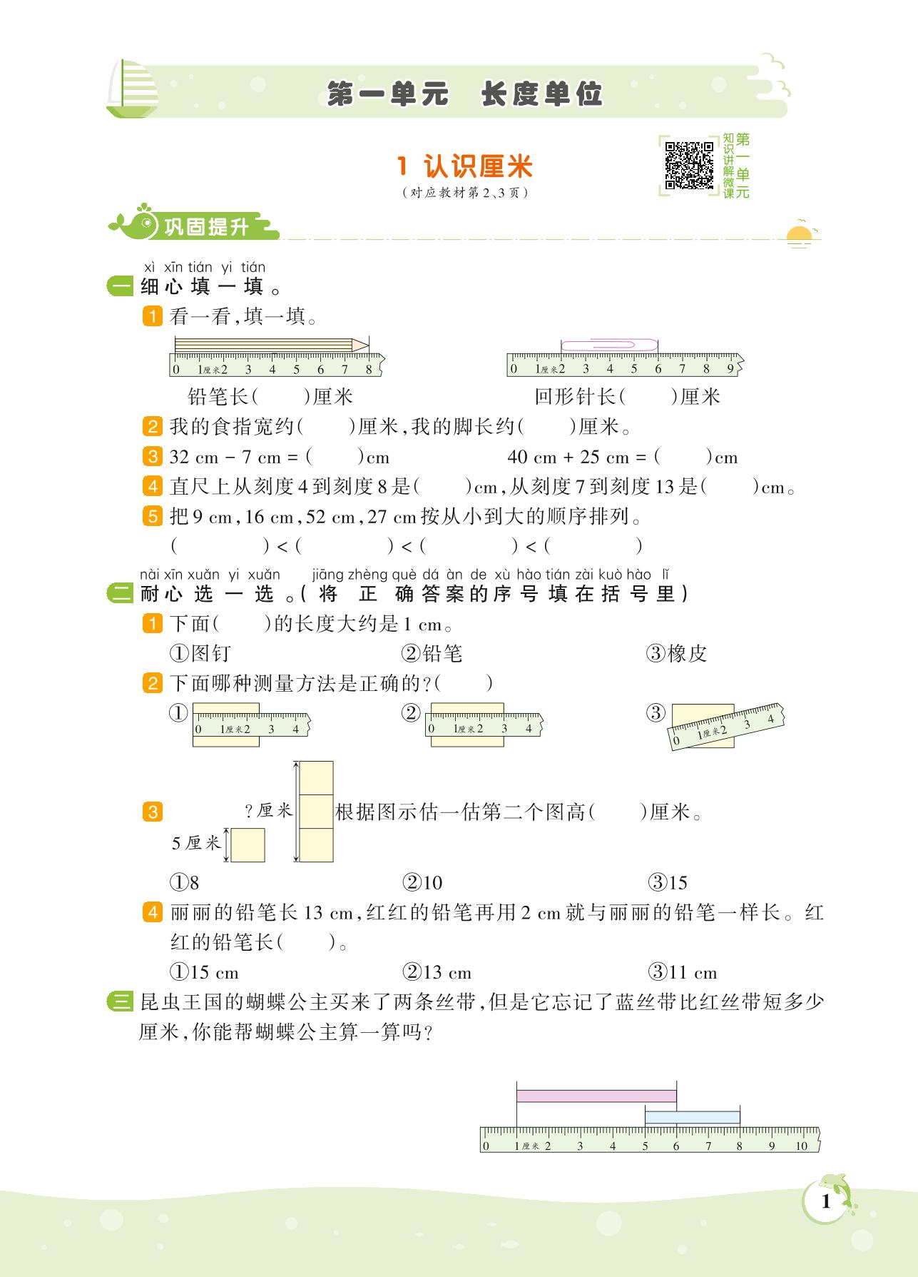 2021上册二年级数学人教版 第一单元 长度单位——1 认识厘米