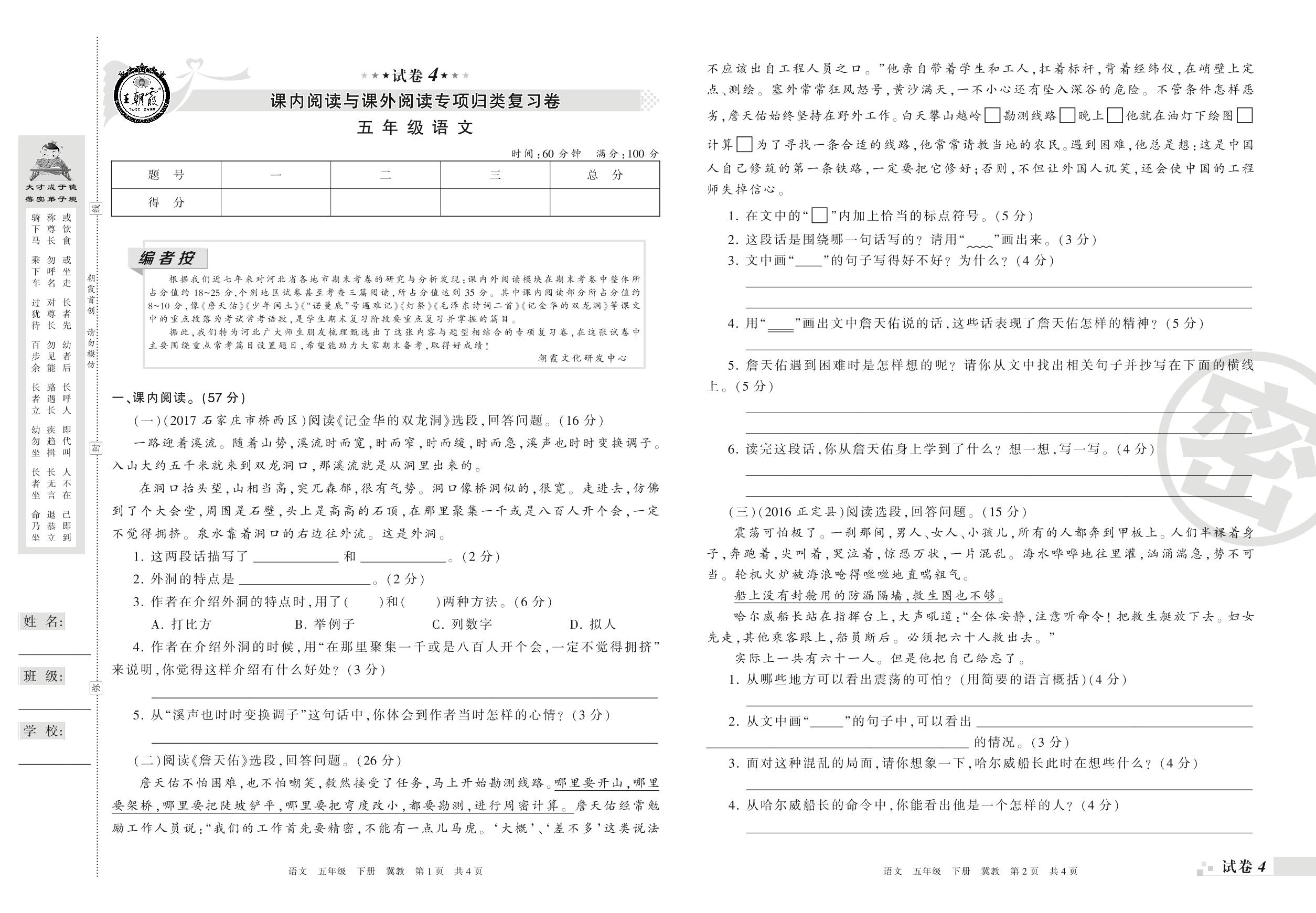 王朝霞期末专项卷——课内阅读与课外阅读专项归类复习卷五年级下册语文(冀教版)_R210801230929【4】