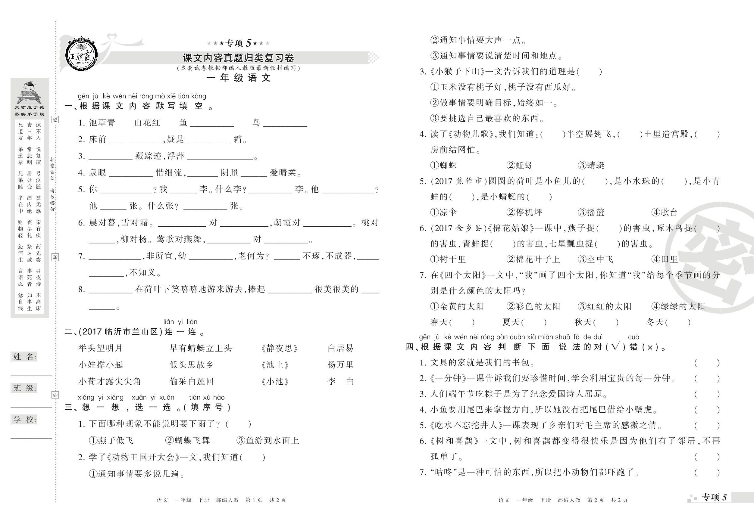 王朝霞期末专项卷——课文内容、积累运用真题归类复习一年级下册语文(人教版)_R210731182757001【0】